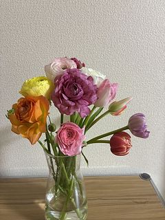 1輪だけ元気のないラナンキュラスがあったりしましたが、生物ならではと思います。 届いてすぐ花瓶に挿し、翌朝には花びらが開いていて変化が感じられ、とってもかわいいです🌷 品種やカラーリングが様々で、眺めていると気持ちが明るくなります🫧