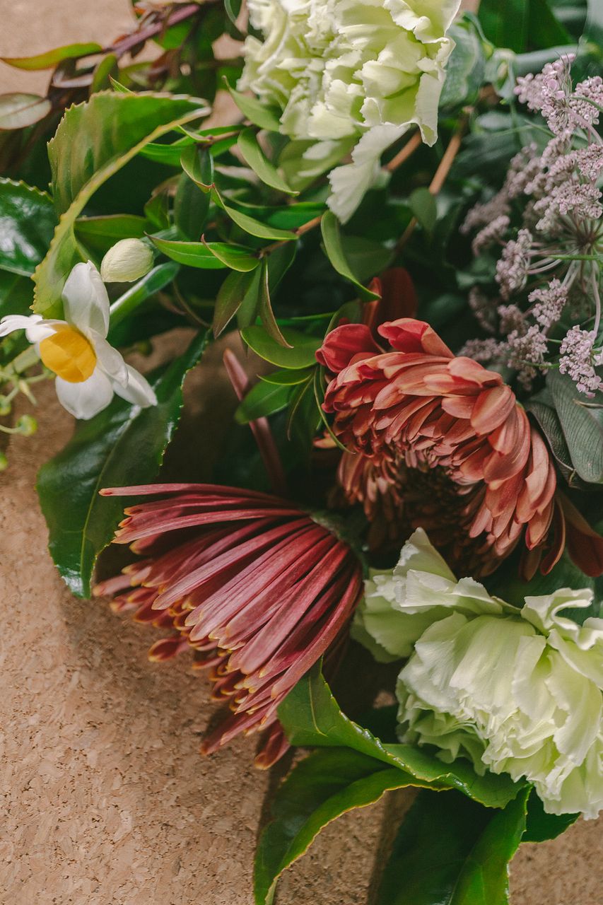 珍しいお茶の葉入り🌿抹茶やほうじ茶を思わせる落ち着いた色合いに、香りのあるグリーンと、マムやスイセンを合わせた花と香りで楽しむ和の一束です🍵