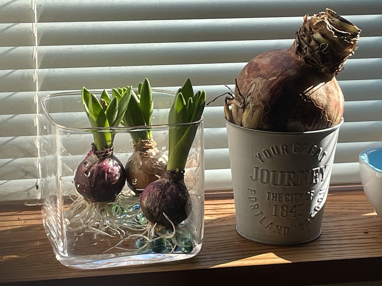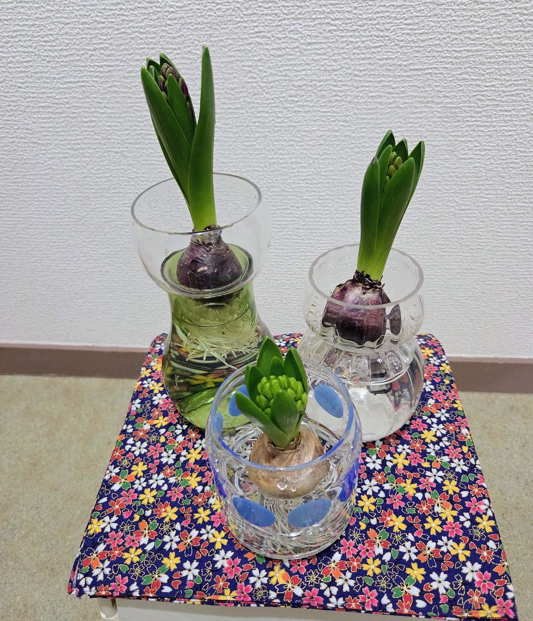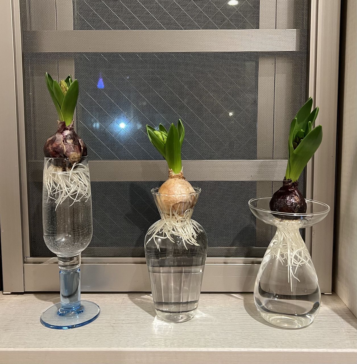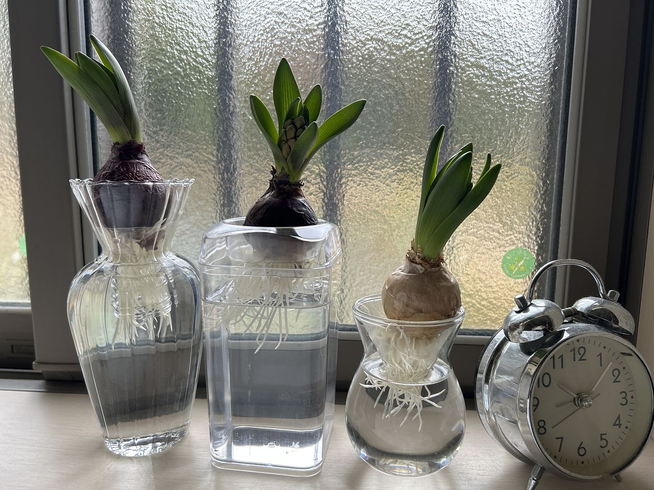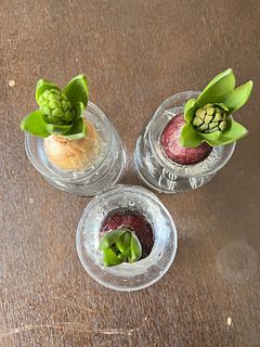 根付ヒヤシンス3種アソートが届きました。 プラスチックの容器に入っているものとばかり思っていたのですが、ビニール袋に入っていました😔 11月中旬に届いた容器つき球根が根が出てはいるものの 芽が出てこないので、その容器と本日届いた容器ともう一つはガラスの瓶に入れました。 蕾も覗いているので、何色が咲くのかとても楽しみでもあり、待ち遠しいです🤗 成長を見守りたいも思います🫡