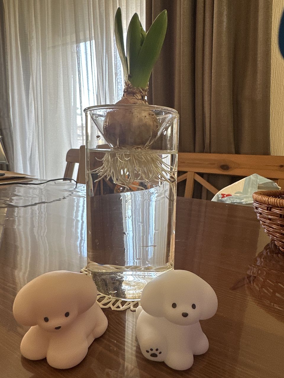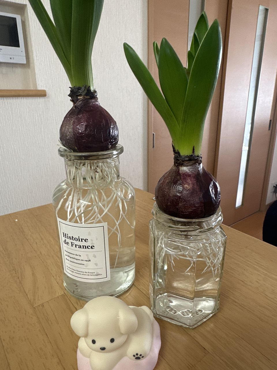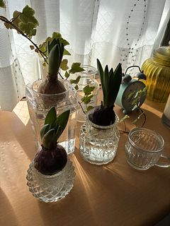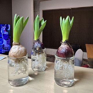 球根の色から、花は色違いだなぁと予想。 根本から一本小粒の球根が付いていたのですが、取れてしまい別皿で育ててます。 種屋さんで水栽培用の球根を買っていたのですが、近年閉店してしまいDIYの併設店で買っていました。 届いた物は小粒でしたが蕾は意外とありそうです。 今から楽しみです。