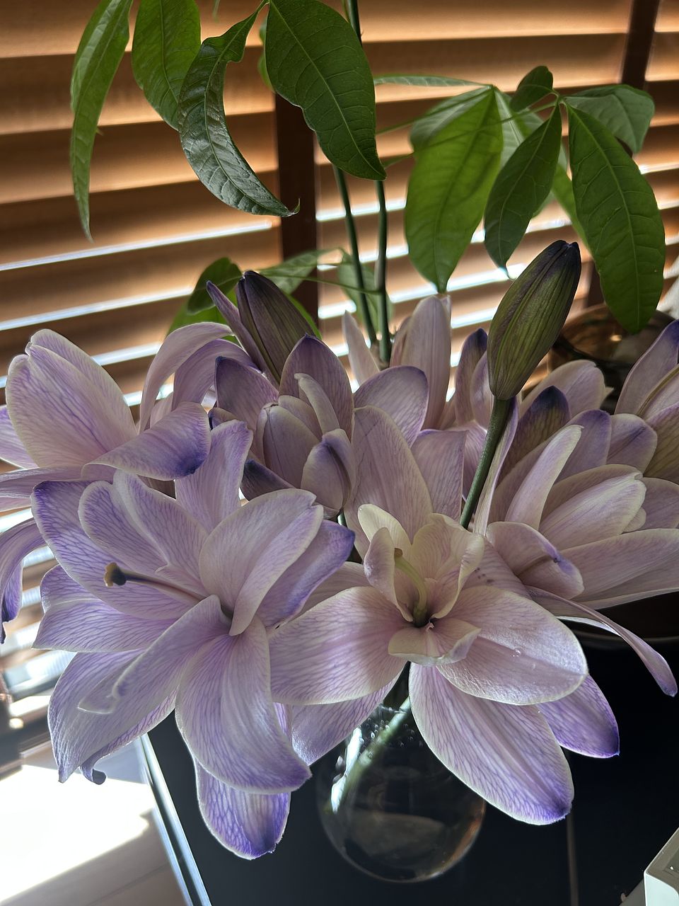 幻想的なラベンダーカラーに染まった百合。八重咲きの品種なので、花粉はほとんどありません。花びらはとても繊細で、傷がつきやすいです。気になる場合は、優しく取り除いてください。