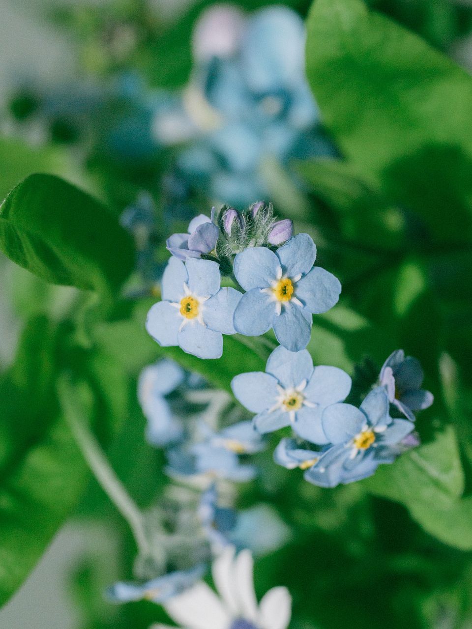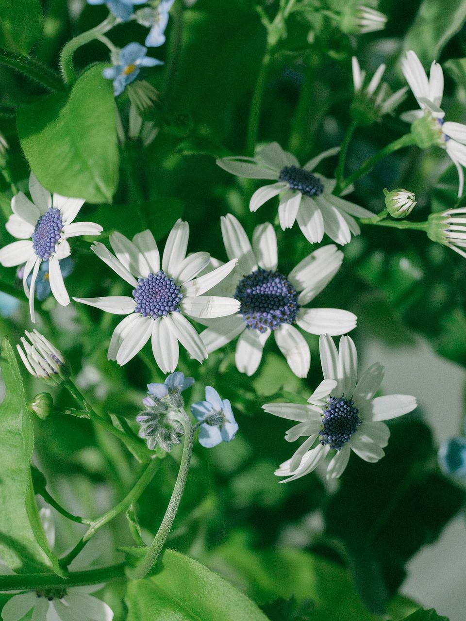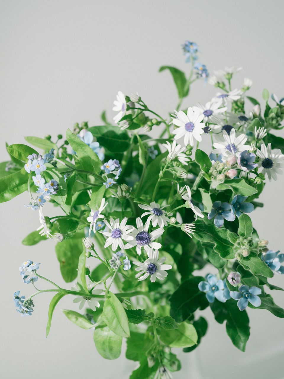 星のかたちをした勿忘草、白い花弁に青紫の芯が映えるサイネリア、やさしい水色のブルースター。