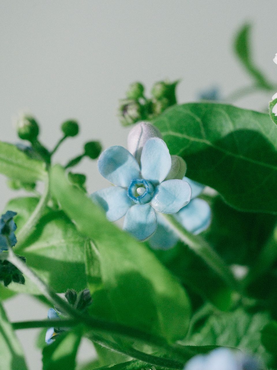 勿忘草とブルースターは湯揚げもおすすめ(花を新聞紙などで保護して1cmほど茎を切り40℃くらいのお湯に10分〜お湯が冷めたら冷たい水に移す)。葉が柔らかく傷つきやすいので、黒っぽくなったら取り除いて下さい。