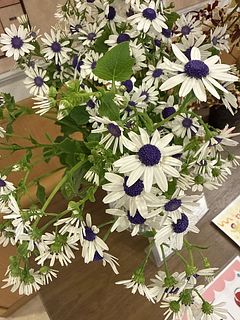 ホワイトの花びらに、ネイビーのコントラストがおしゃれ。花言葉は「喜び」。