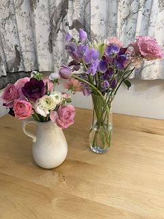 ピンクの濃淡とふわっとした透け感が可愛くて大満足です。同時に購入したスイトピーと一緒に行けてみました。白い小花も足してみました。