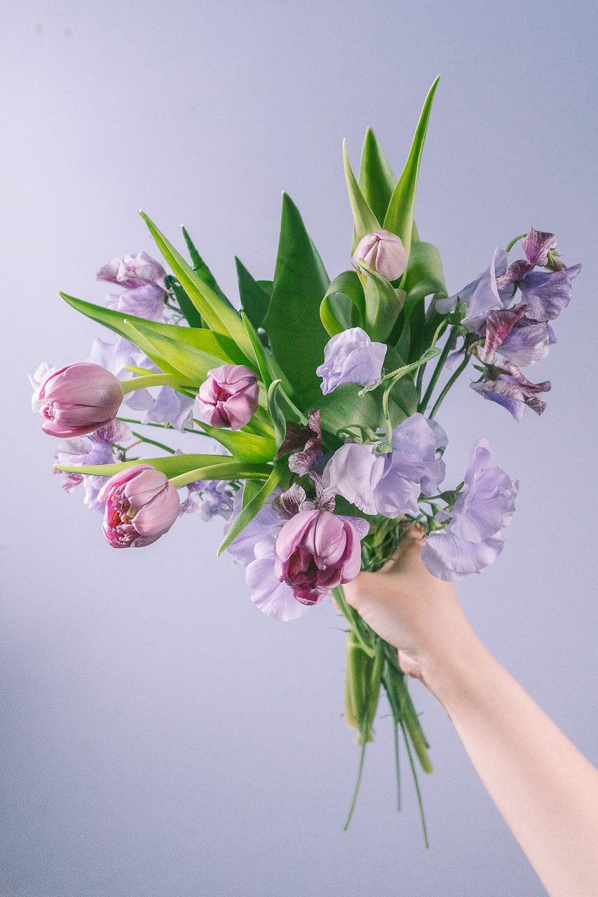 淡い紫を中心に丸みのあるチューリップとふんわり軽やかなスイートピー。