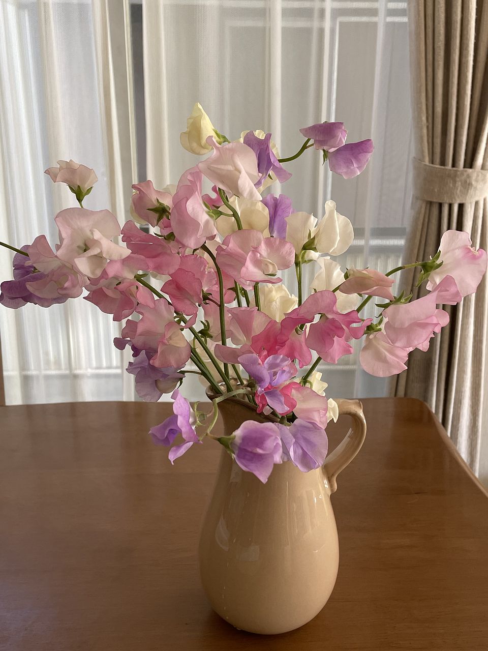 可愛らしいいい香りのスイートピーが届きました! お部屋がパッと明るくなり、香りで癒されています。