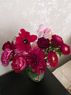 自分の誕生日に初めて購入したブーケ ガーネットを思わせる色味、お花の量も大満足でした。