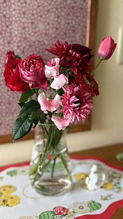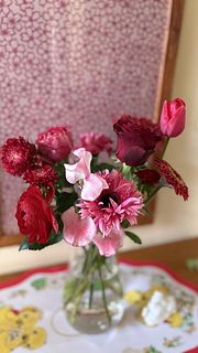 濃いめピンクの色合いが素敵でした。ボリュームもあります。 バラとスイートピーとチューリップの香りもよく、近くに行くと薫ってきます。