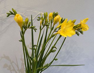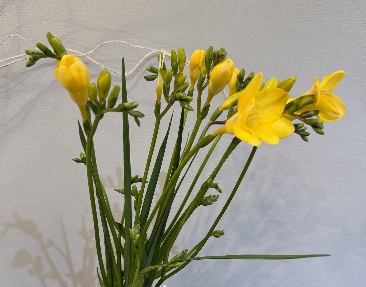 今回も生き生きしたフリージアが届きました。 この時期フリージアを欠かすことの無いよう、届けていただけるようスケジュールを組んでいます。 残念な事に、また一本折れていました。 取り出す時に不注意で折ってしまったのかと思いましたが、折れた先の花が少しグッタリし始めていたので、届く前に折れていた可能性があります。