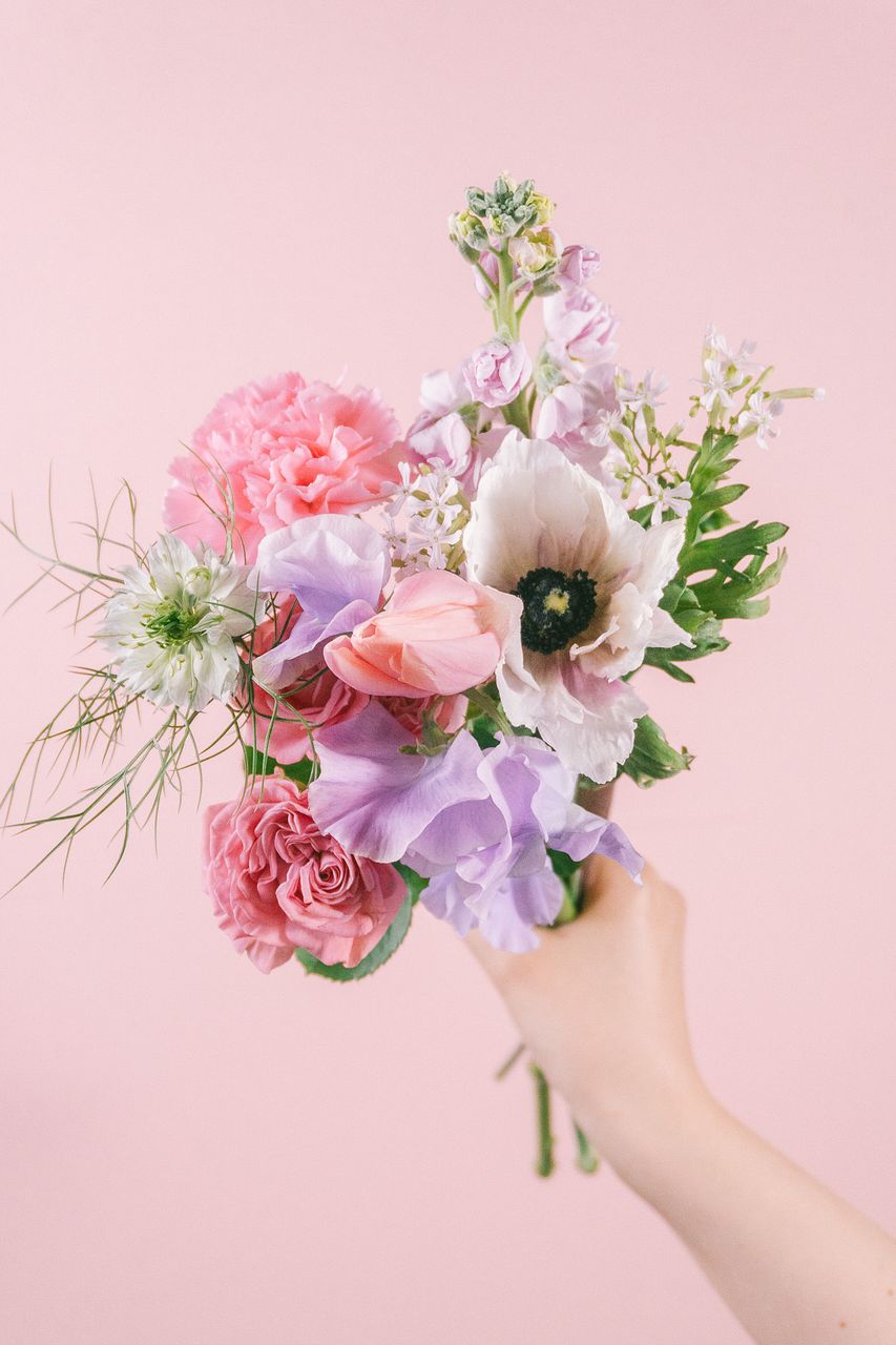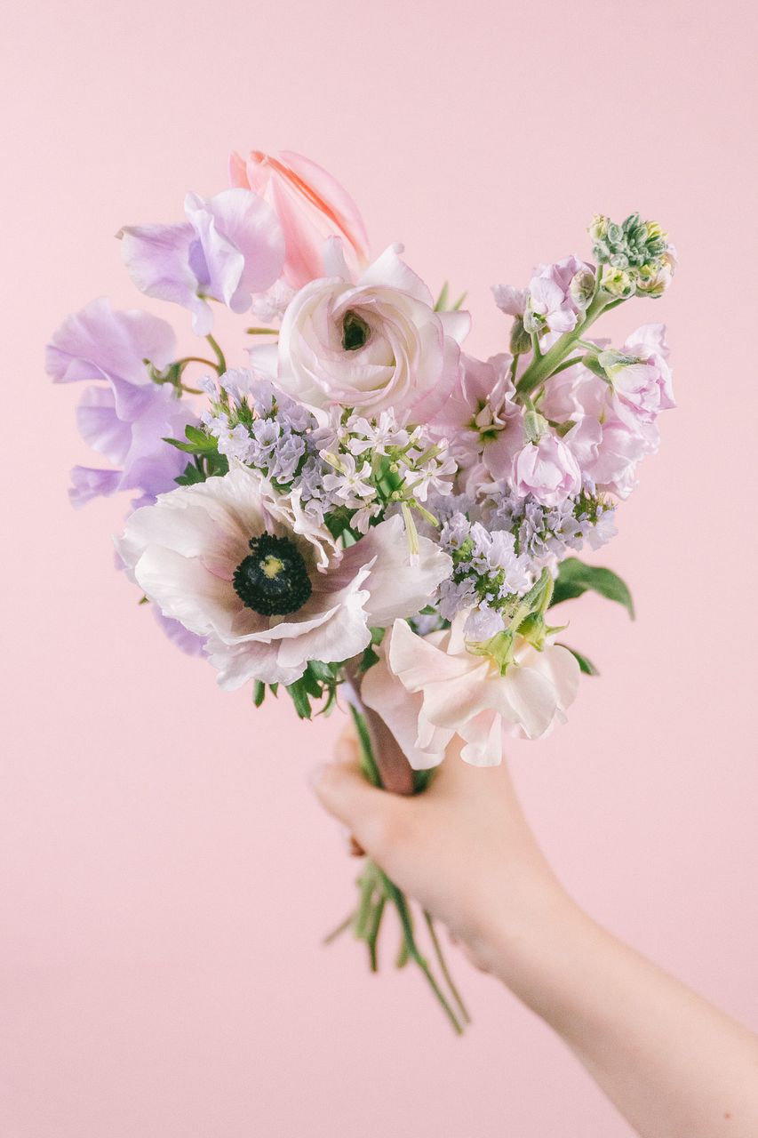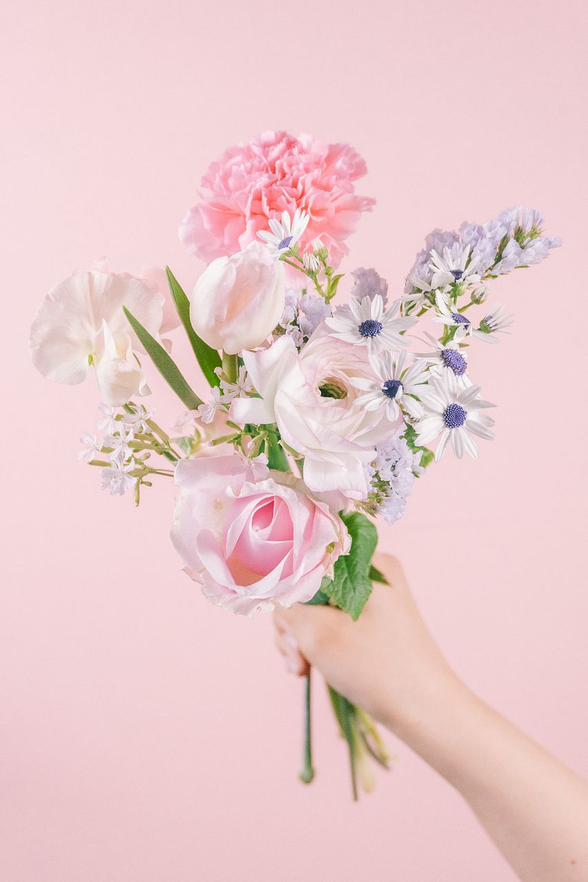 一輪で心を奪うお花を主役に、淡いピンクやラベンダー、春色の草花をそっと添えました。