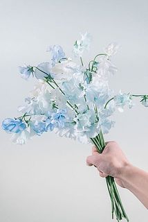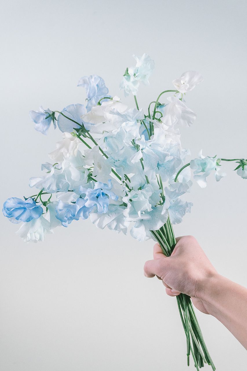 淡いブルーが重なる、空色のスイートピーとブルーの花瓶をセットでお届け💙