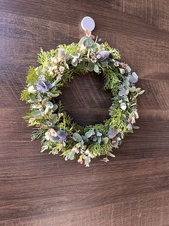 ワックスフラワーやエリンジウムを組み合わせて。ドライに向いてるお花をセレクトしています。ユーカリの香りも楽しんで! ワックスフラワーは葉っぱをこするととっても良い香り。