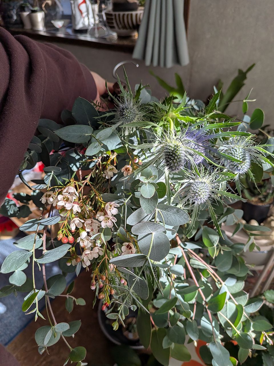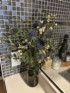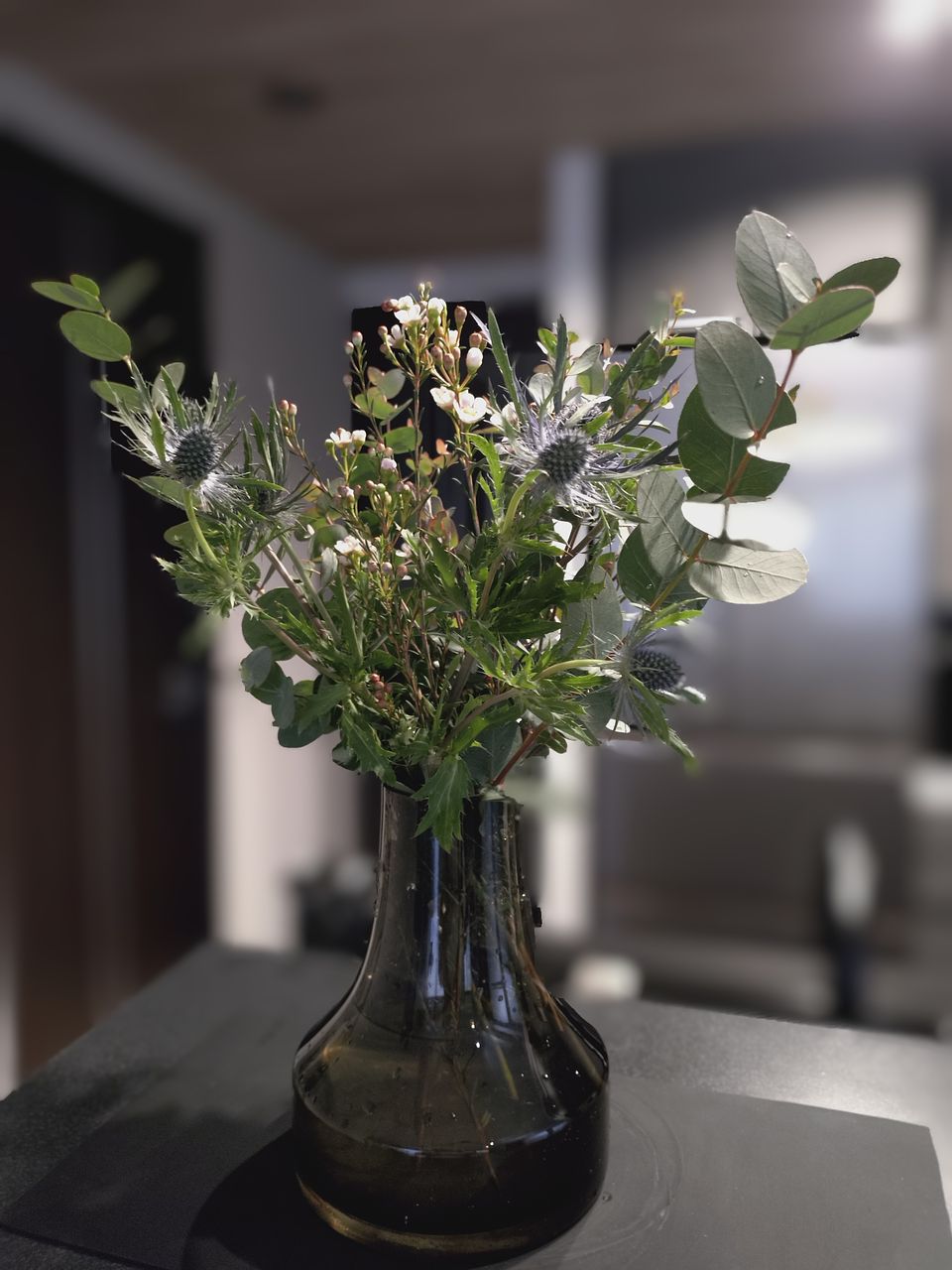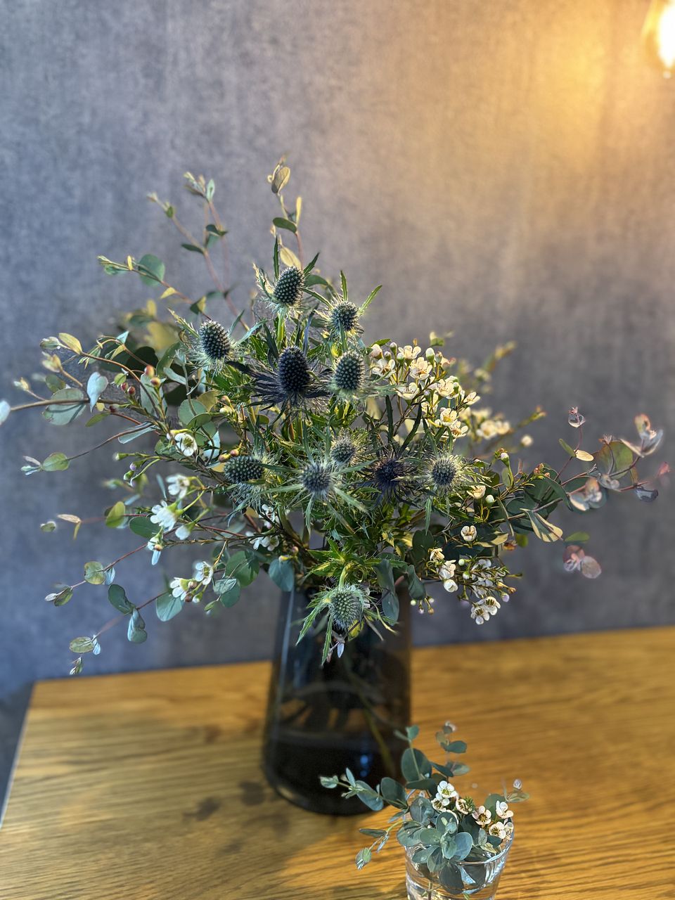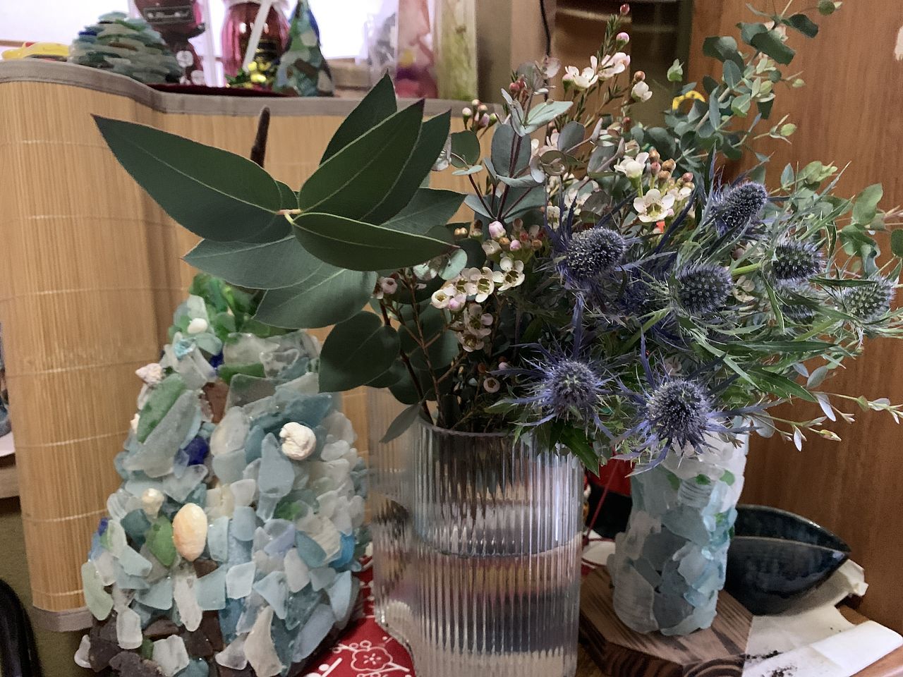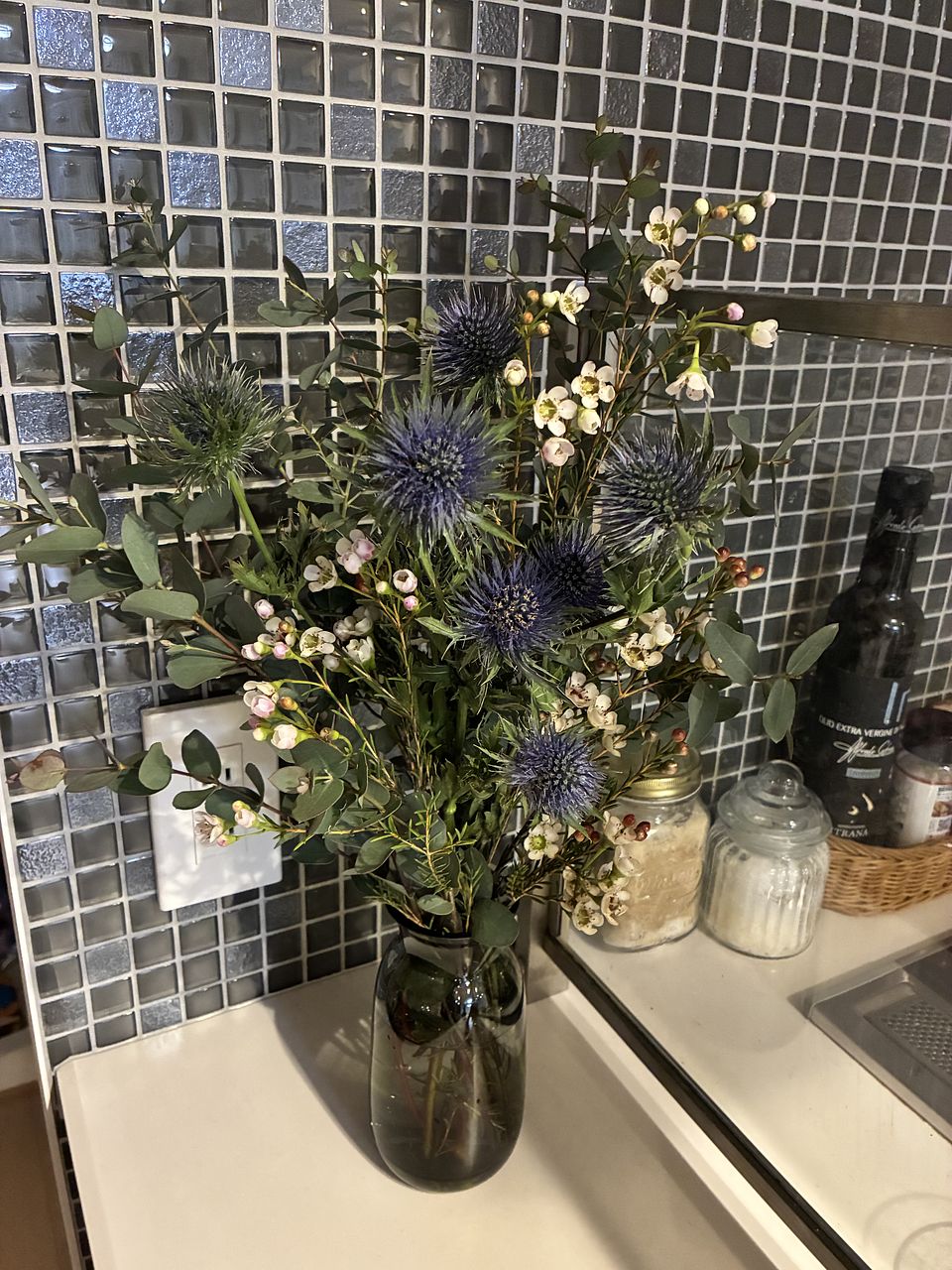 家族に華がないと言われてしまった。確かにユーカリの葉っぱがちょっと緑では無かったりしたので暗い感じだった。 エリンジウムも二本だったからかあまり目立たなかった。