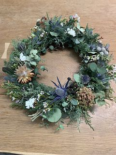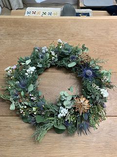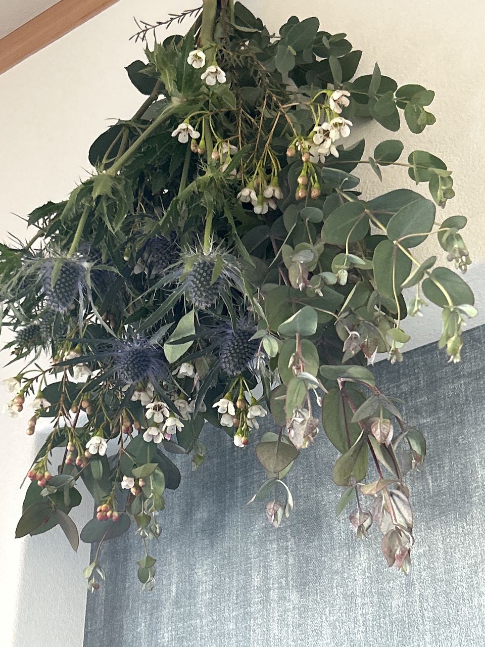 ボリューム満点のスワッグが届きました!そのまま飾っても良かったけど、自家製ユーカリ、ローズマリーを合わせてリースにしました!エリンジウムも大きくてアクセントになりました!