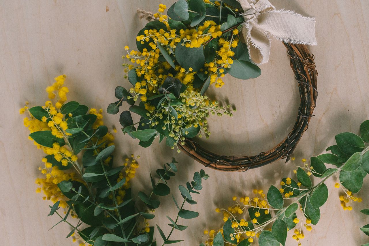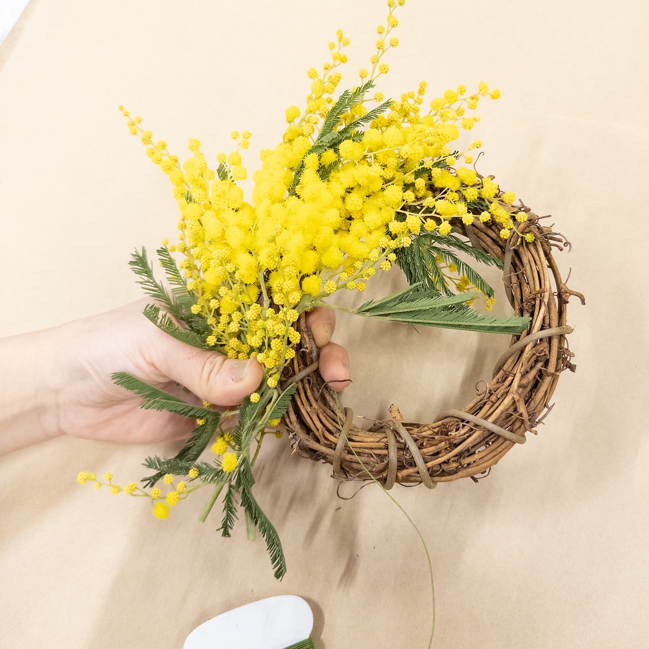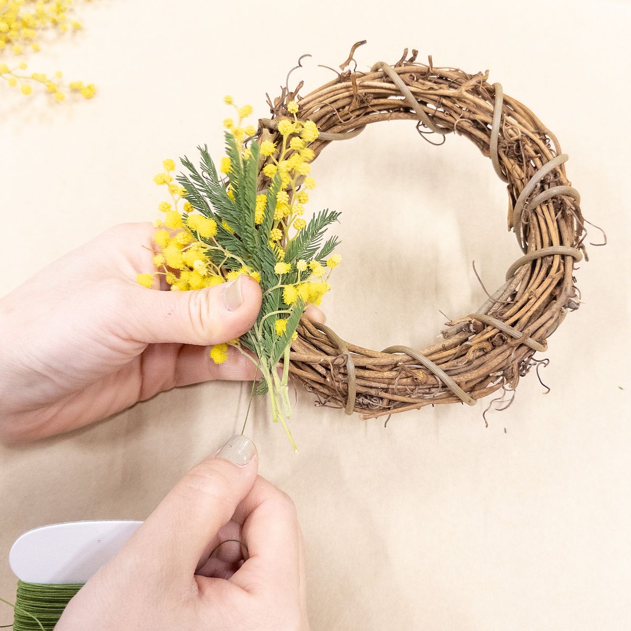 3〜5パーツほど手で抑えながら土台に沿わせてリースワイヤーで2周ほど巻きます ※今回ミモザの種類は写真と異なります