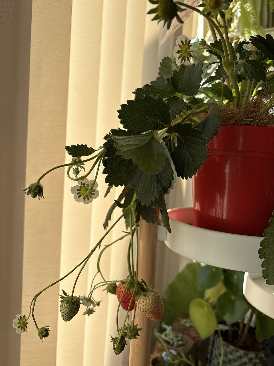 いちごの実もお花も咲いていて、とても満足しています。鉢が赤いのもかわいいです。収穫するのが楽しみです。