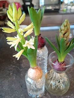 球根の色から、花は色違いだなぁと予想。 根本から一本小粒の球根が付いていたのですが、取れてしまい別皿で育ててます。 種屋さんで水栽培用の球根を買っていたのですが、近年閉店してしまいDIYの併設店で買っていました。 届いた物は小粒でしたが蕾は意外とありそうです。 今から楽しみです。