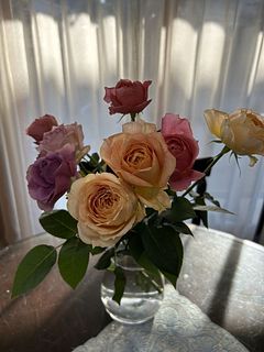 バラ「キャラメルアンテーク」とコーラルピンクの「ロマンティックアンティーク」だけを束ねて🫶