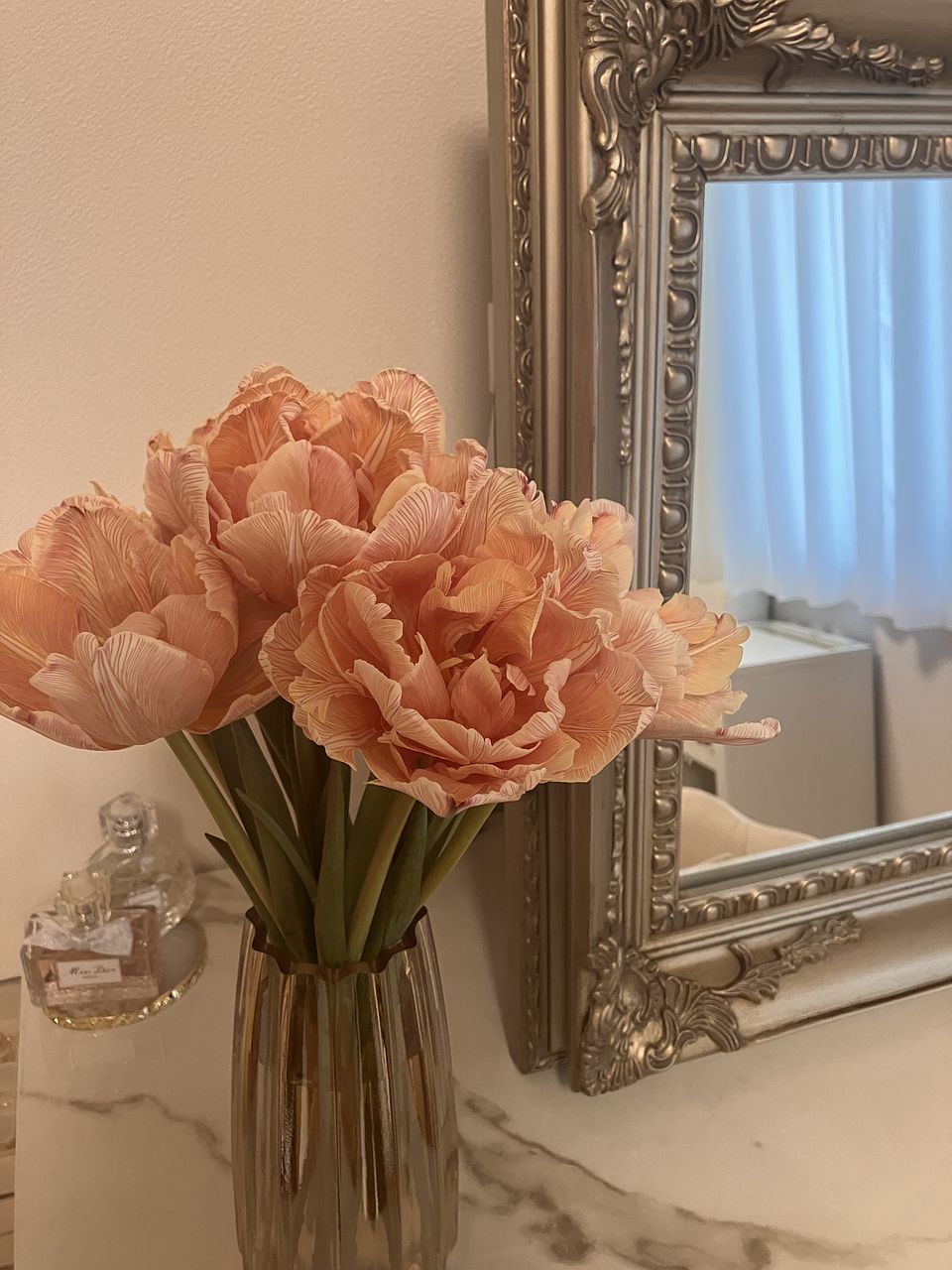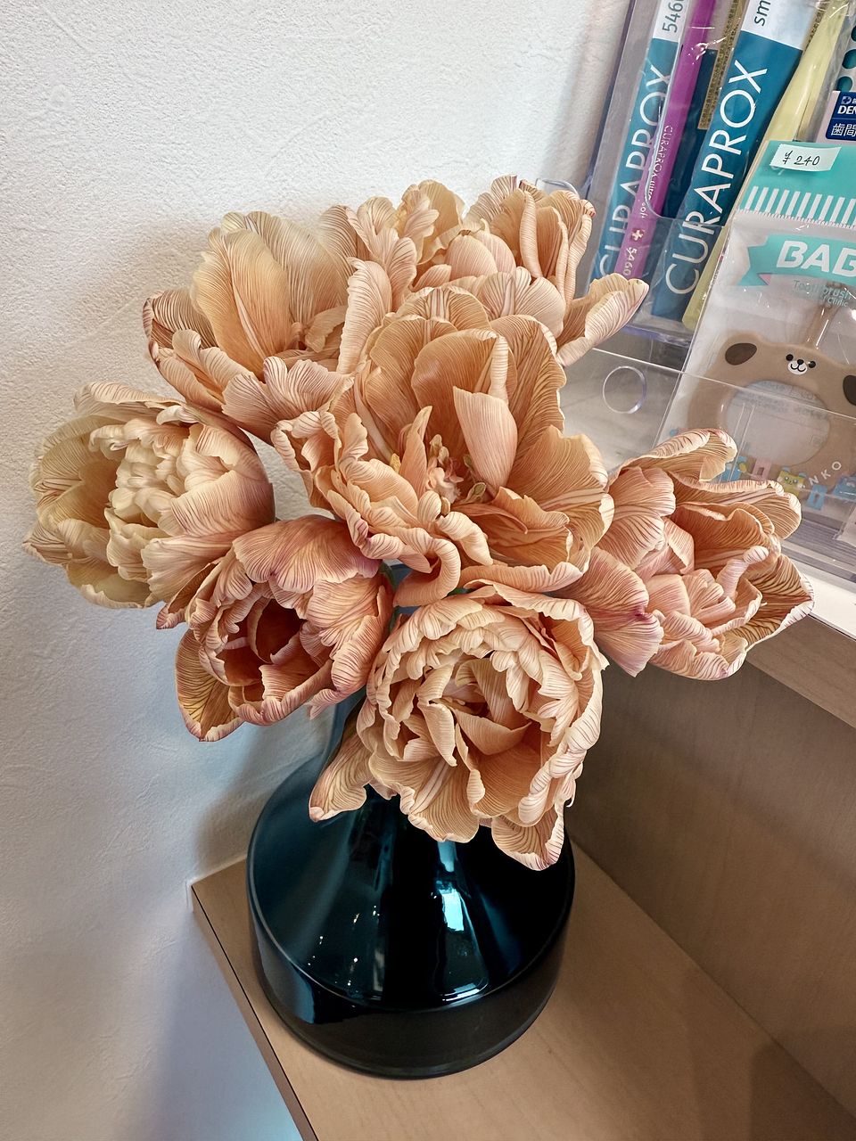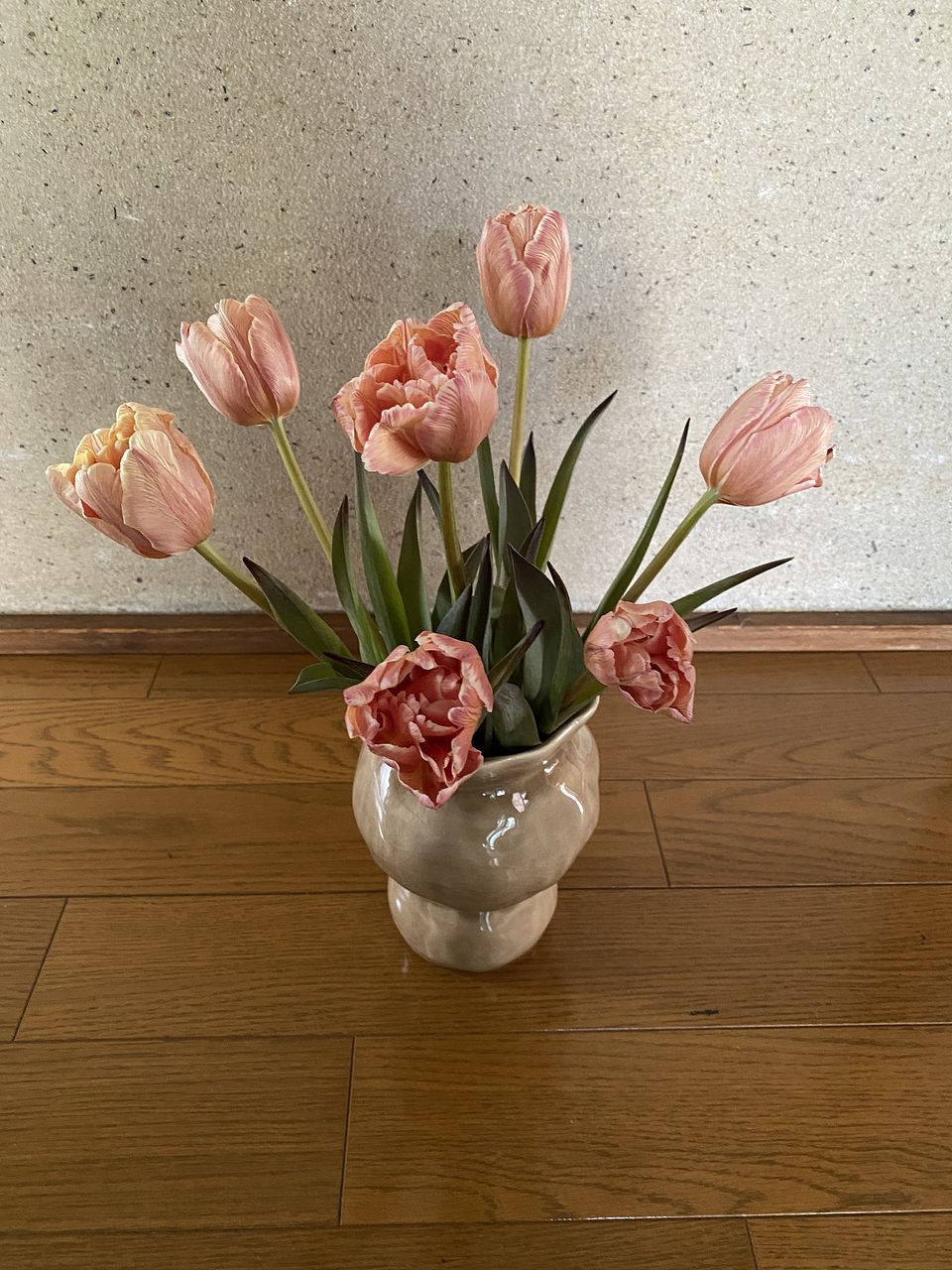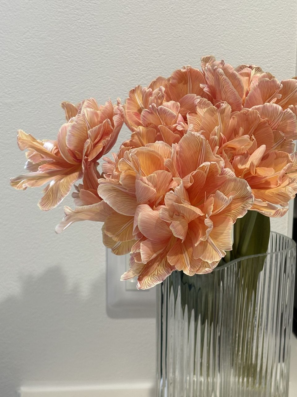 オレンジのようなピンクのようなイエローのような…驚くほど美しいチューリップでした🥹 一緒に購入した「絵画のように花を楽しむ」花器に生けました。この花器もすごく良かったです♡ キッチンに置いていたら開いてしまったので 気温の低い階段に置いたらダークな色の 暗い階段が明るく可愛くなりました。 八重咲きでとても素敵です。 この可愛いチューリップがドライになるなんて‼️ どんな姿を見せてくれるかとても楽しみです😊 素敵なお花をありがとうございました😊✨