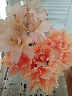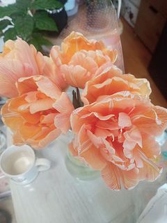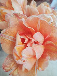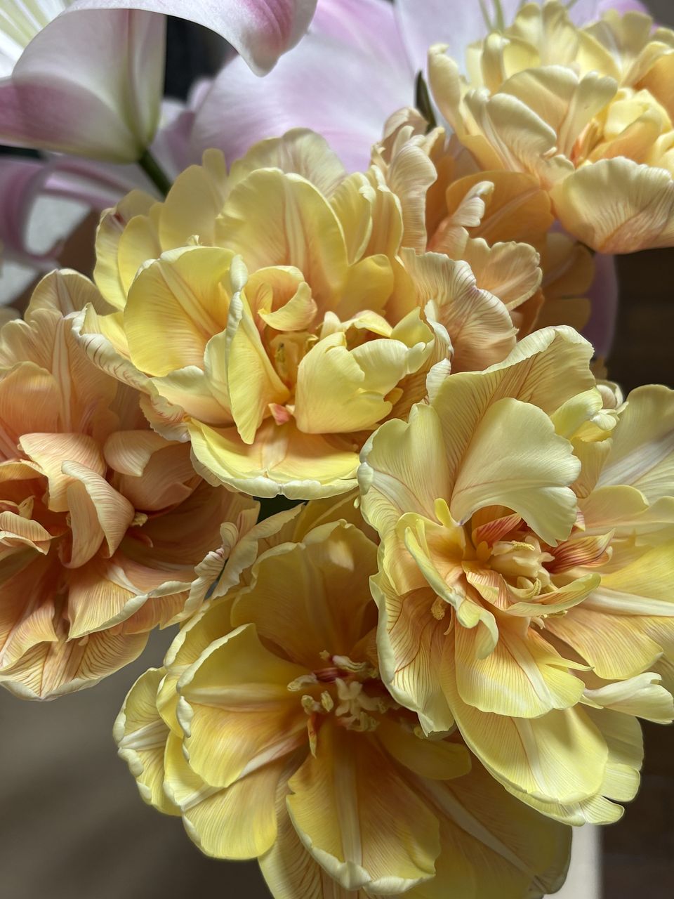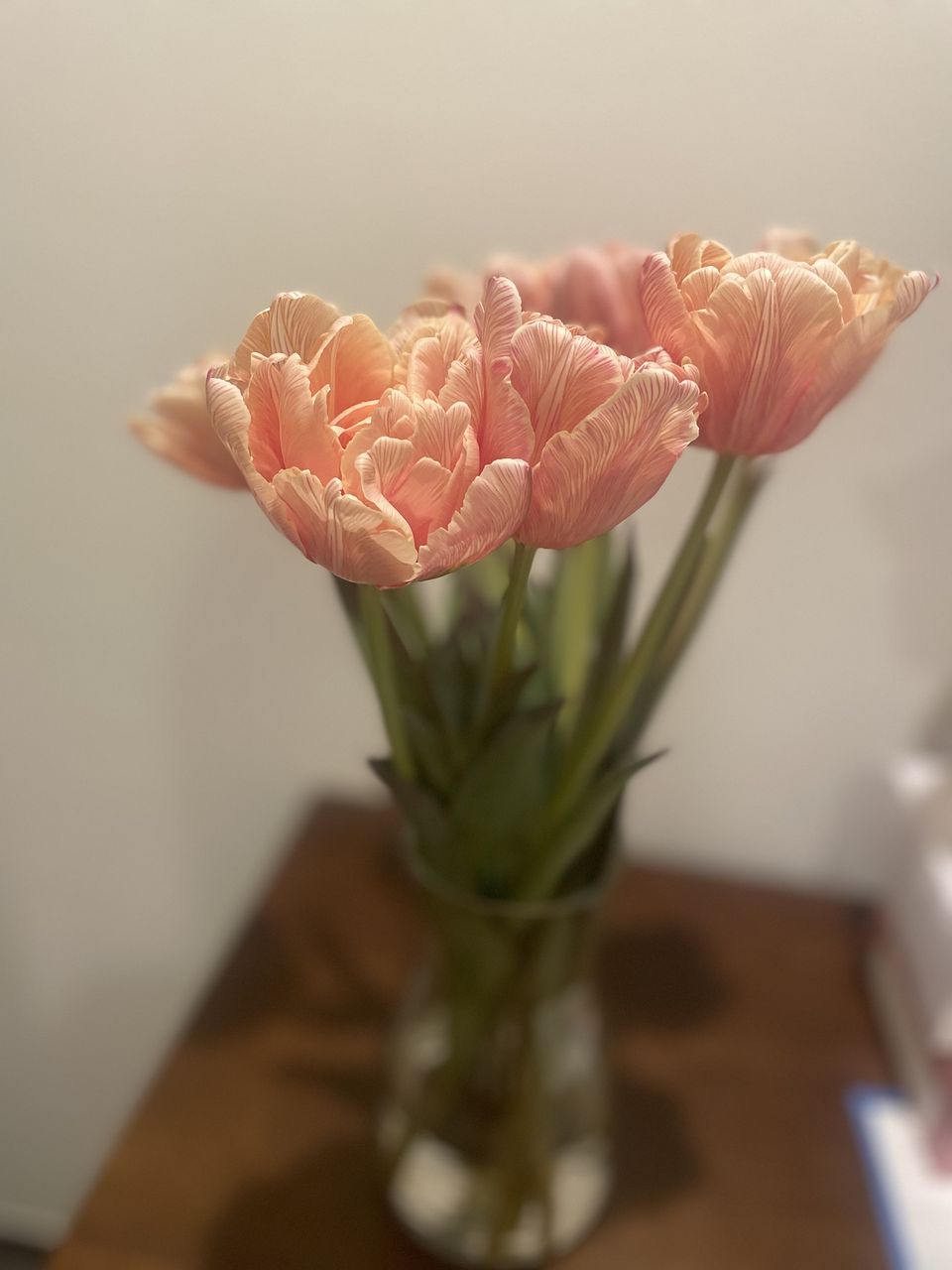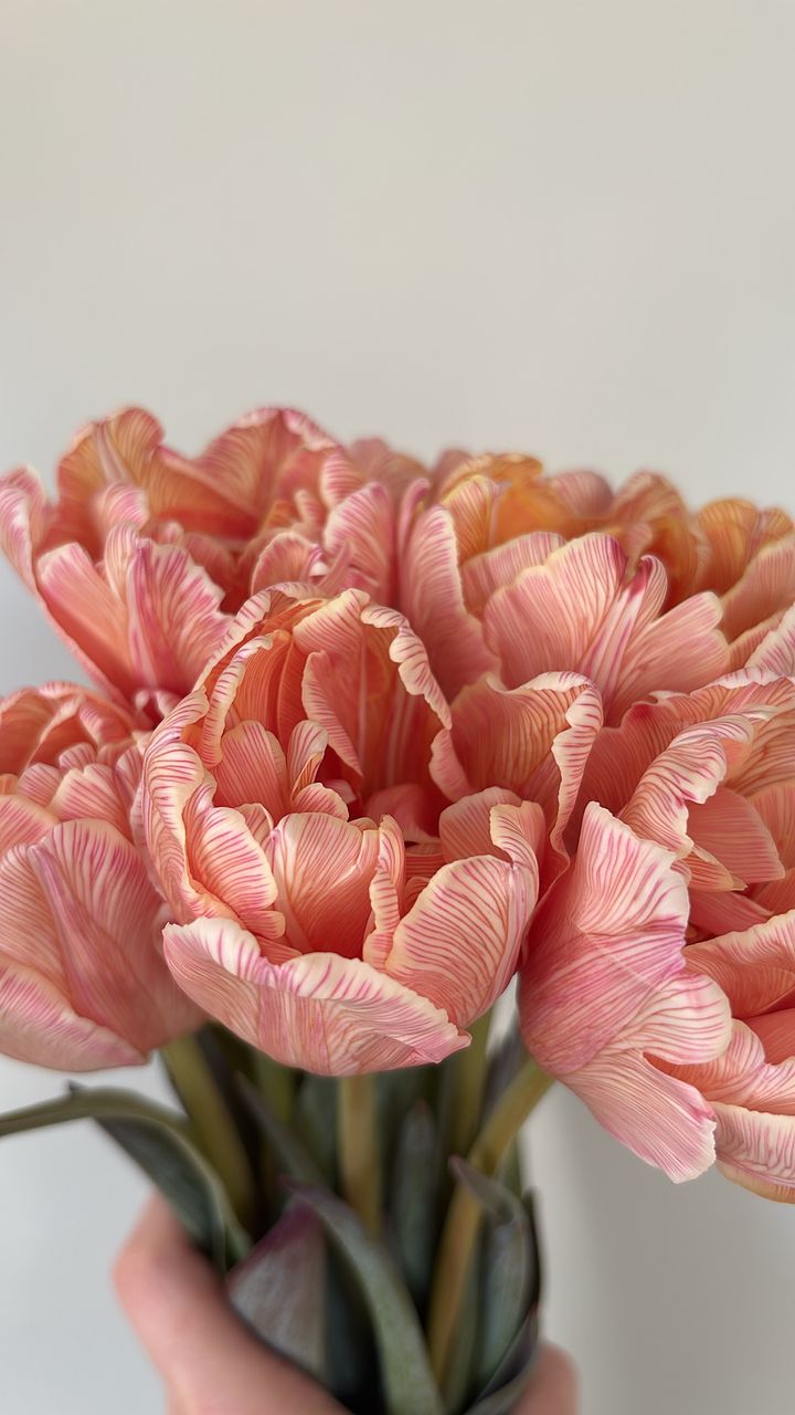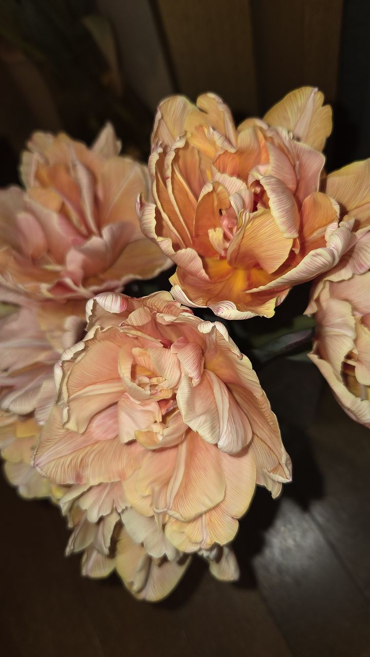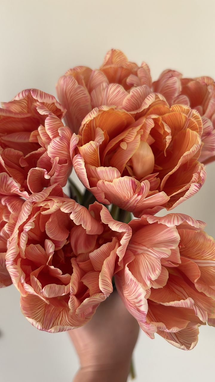 オレンジのようなピンクのようなイエローのような…驚くほど美しいチューリップでした🥹 一緒に購入した「絵画のように花を楽しむ」花器に生けました。この花器もすごく良かったです♡ キッチンに置いていたら開いてしまったので 気温の低い階段に置いたらダークな色の 暗い階段が明るく可愛くなりました。 八重咲きでとても素敵です。 この可愛いチューリップがドライになるなんて‼️ どんな姿を見せてくれるかとても楽しみです😊 素敵なお花をありがとうございました😊✨