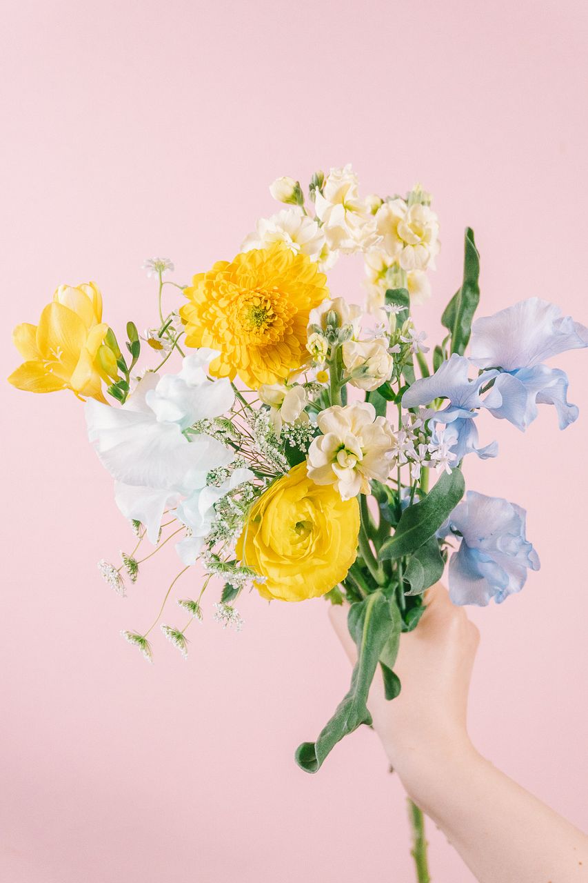 はにかみやさんのイエローに、ふわっと広がる空色ブルー。見ているだけで気分がぱっと晴れる、春色ブーケ💛🩵