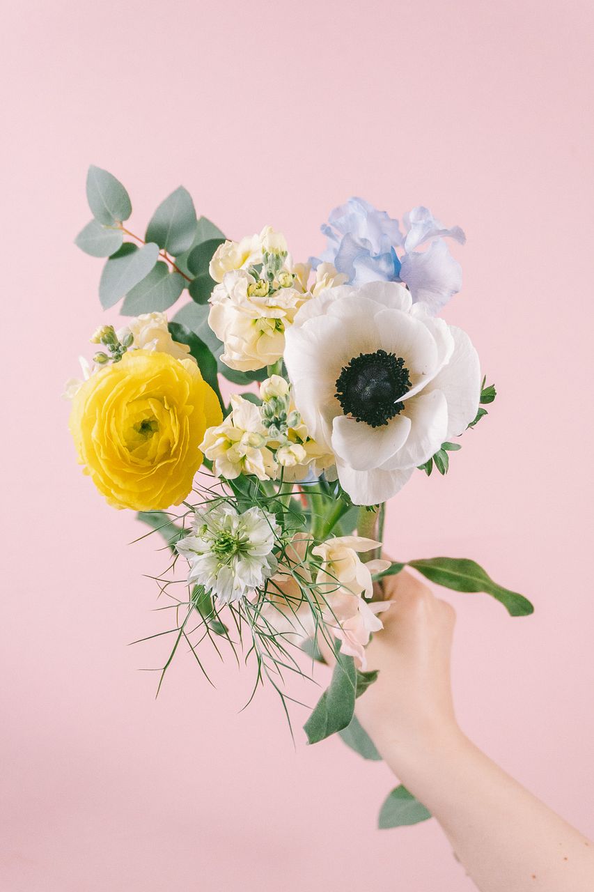 ラナンキュラスやアネモネ、スイートピーなど、表情の違う花たちをリズミカルに束ねて、軽やかで楽しい雰囲気に仕上げました。