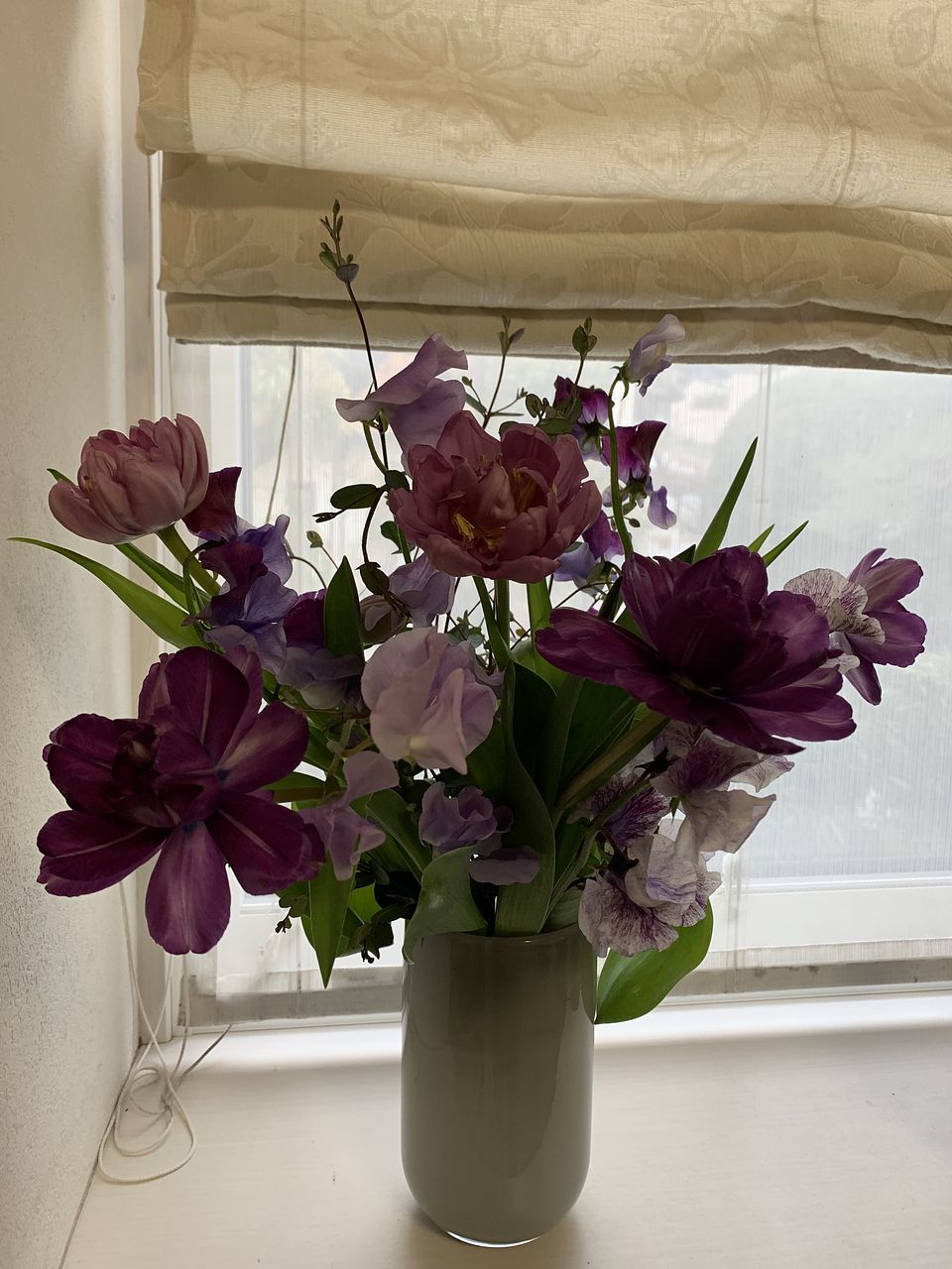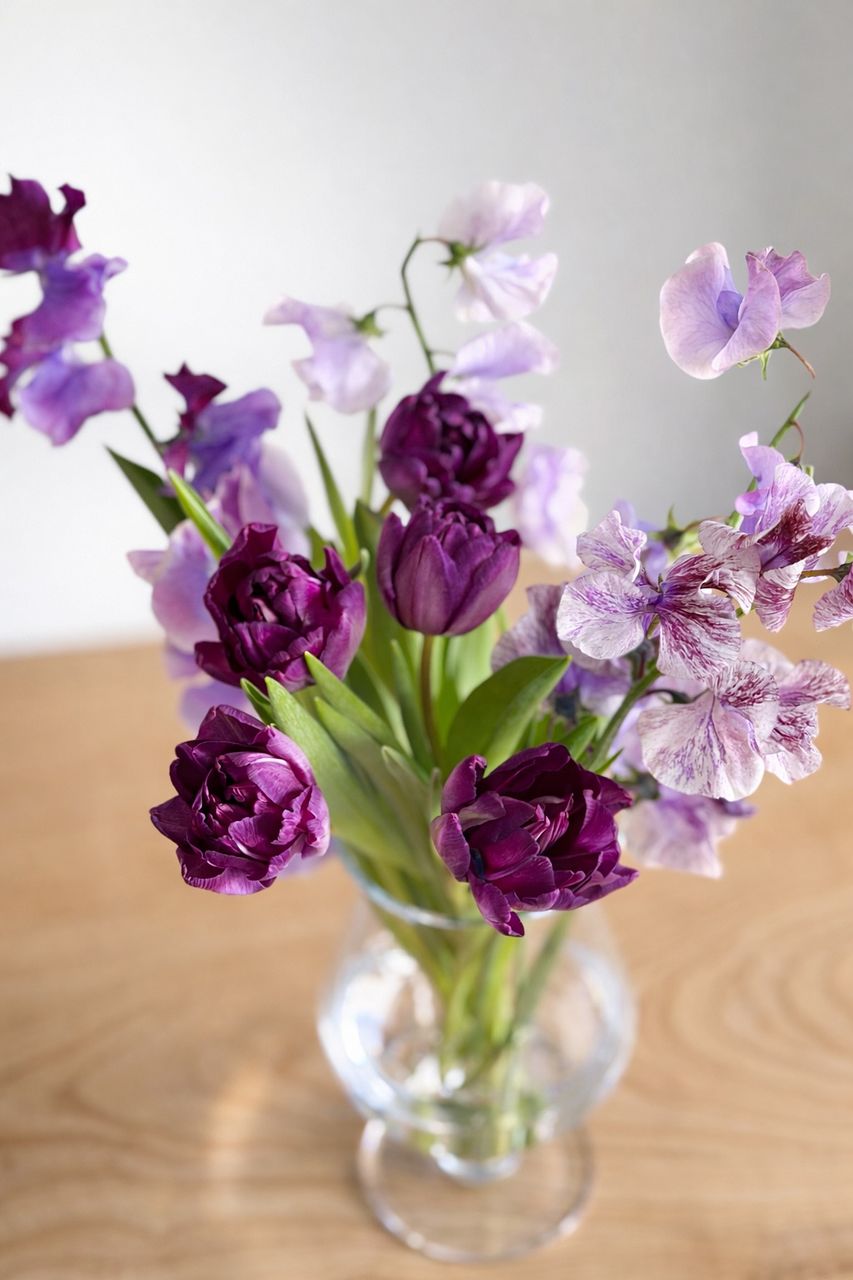 淡い紫を中心に丸みのあるチューリップとふんわり軽やかなスイートピー。
