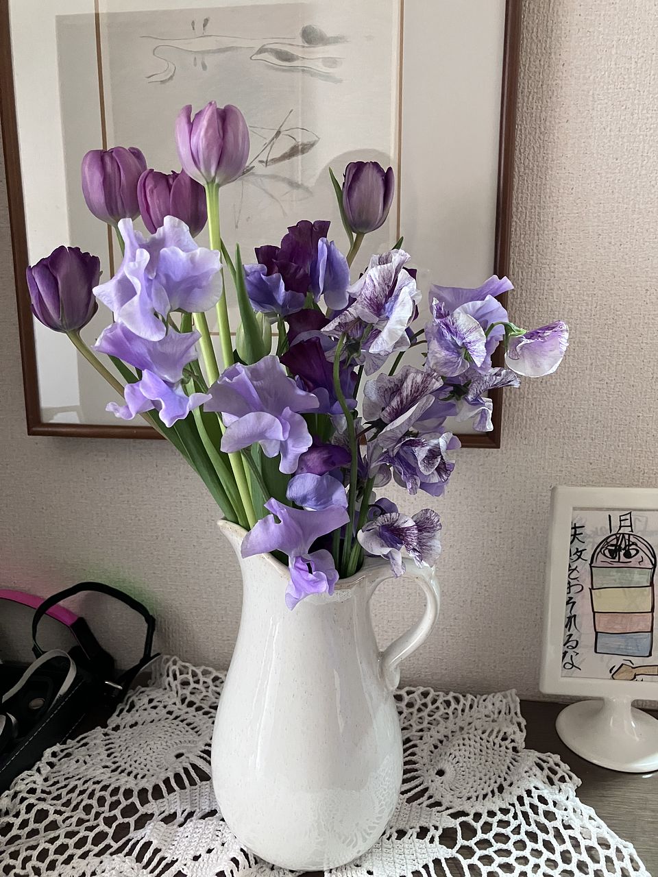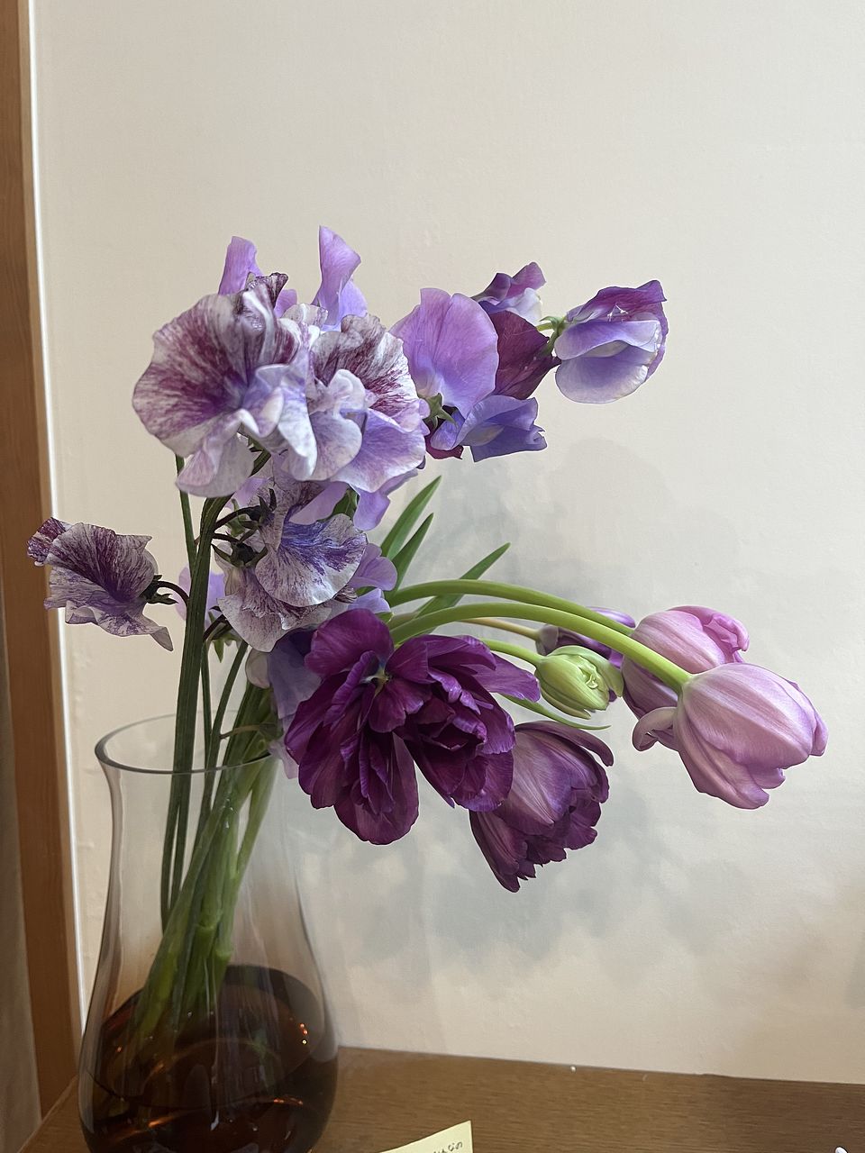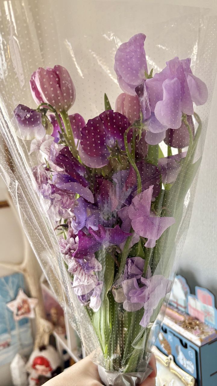 ステキな花束が届きました。 チューリップ5本、スイートピー6本、それぞれ2本づつ紫色の濃淡があり、花瓶に生けると色味の深さとボリュームを感じます。 直ぐにもリピートしたいくらいステキです❤️