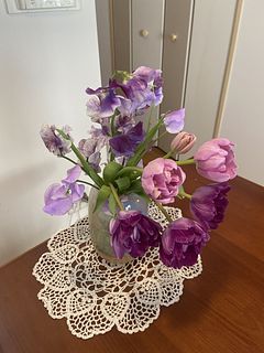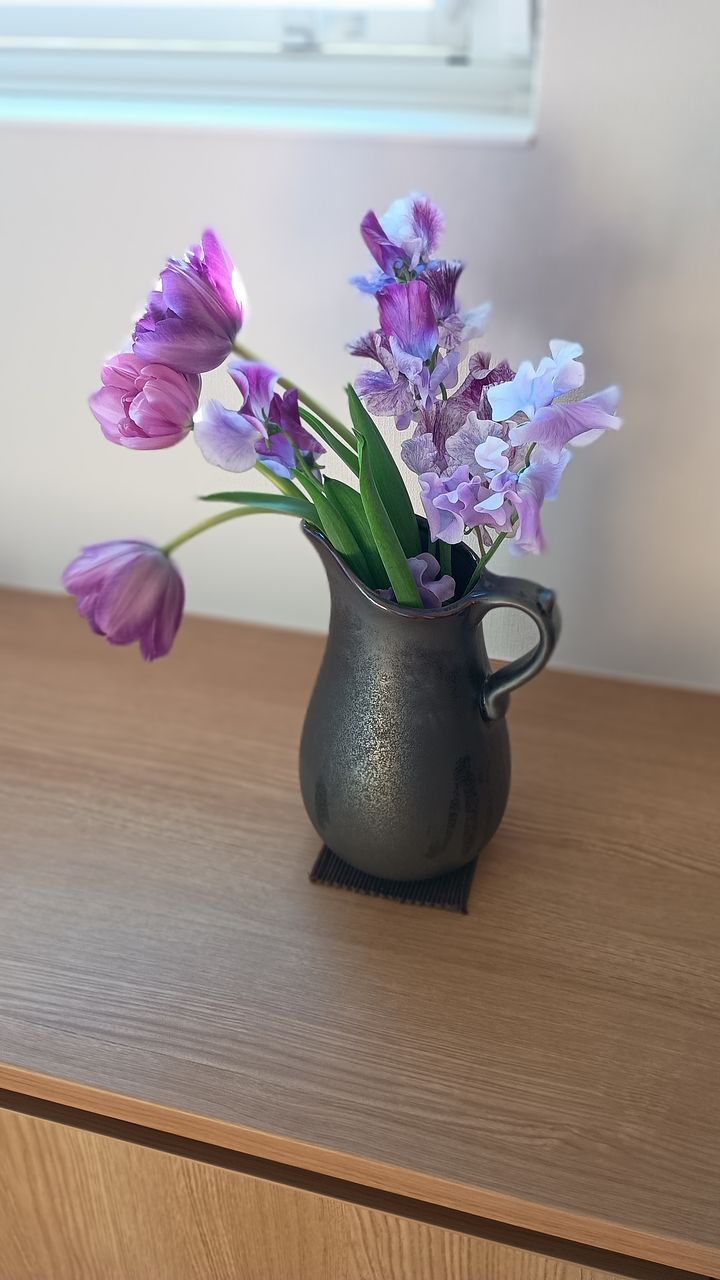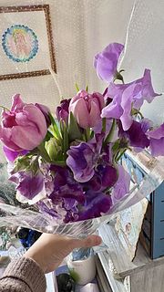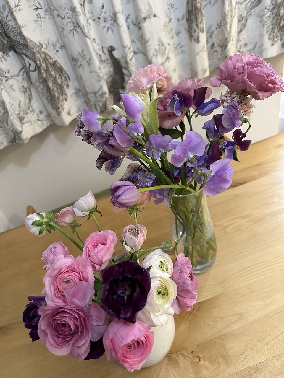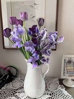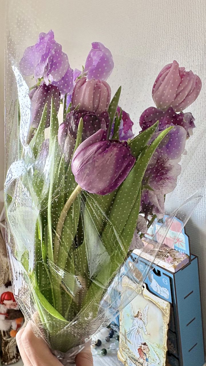 ステキな花束が届きました。 チューリップ5本、スイートピー6本、それぞれ2本づつ紫色の濃淡があり、花瓶に生けると色味の深さとボリュームを感じます。 直ぐにもリピートしたいくらいステキです❤️