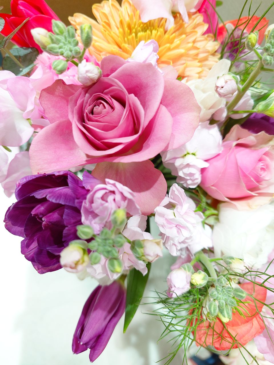 自分では選ばないビタミンカラーの薔薇なども入っていて楽しいです。 たくさんの種類の花々で心が躍ります。 ありがとうございました。