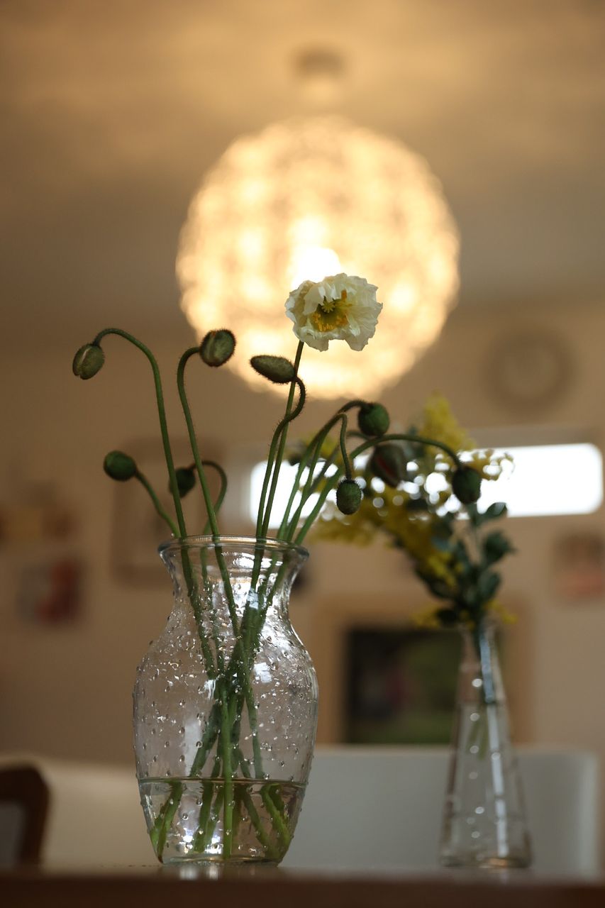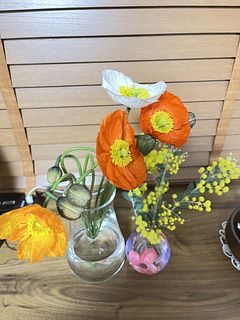 ミモザは可愛い😍し、ポピーは一輪だけ開いてて、あとは蕾でで届きましたが、水揚げして花瓶にさすと数時間で二輪咲きました。 いけ方の例のようにミモザはポピーとは別花瓶に横に置くとより可愛く一気に春がやってきた感じです。