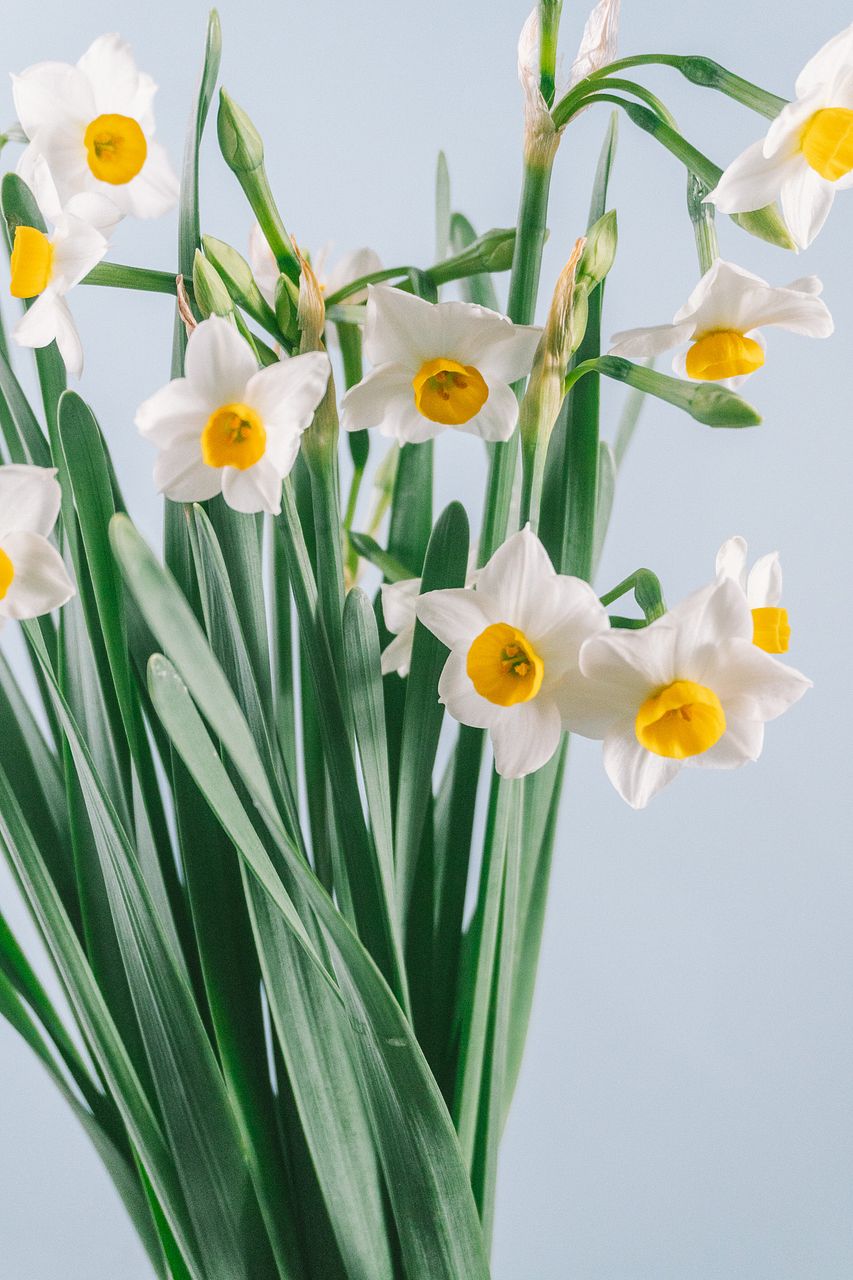白い花びらと黄色の芯が印象的なスイセンのブーケ。