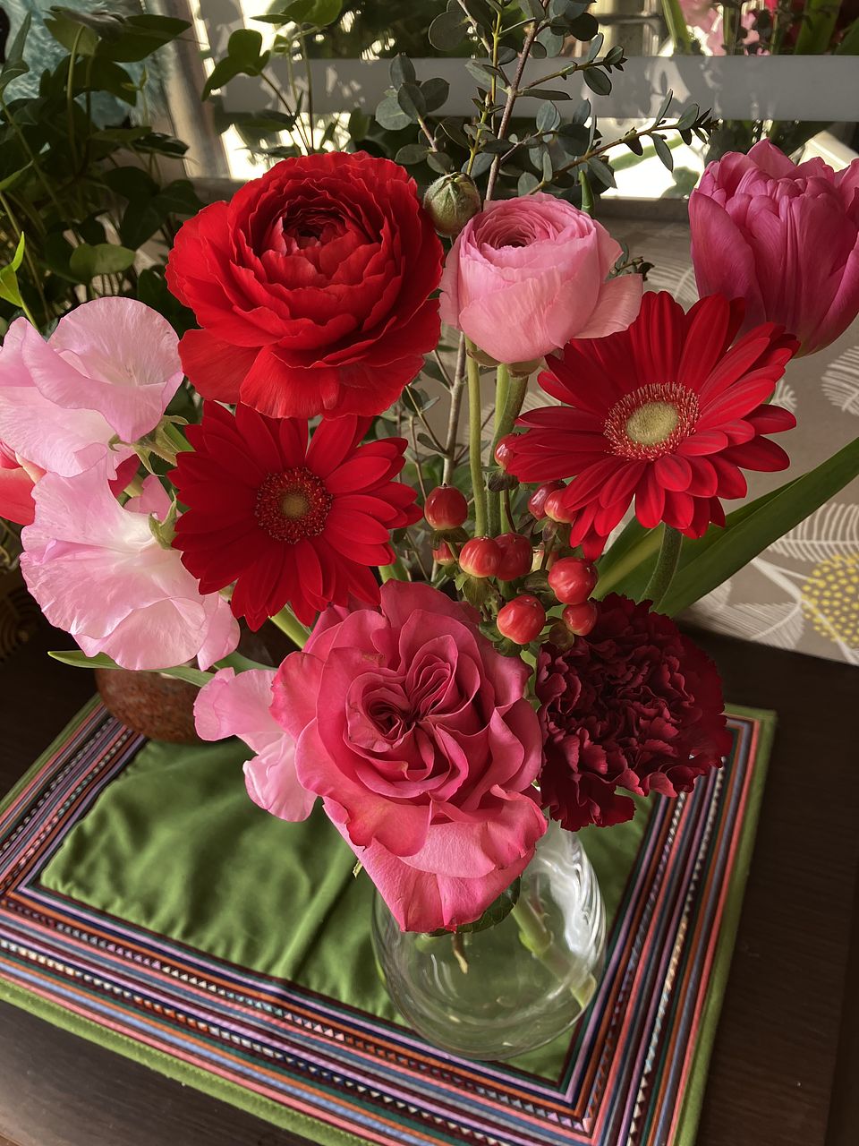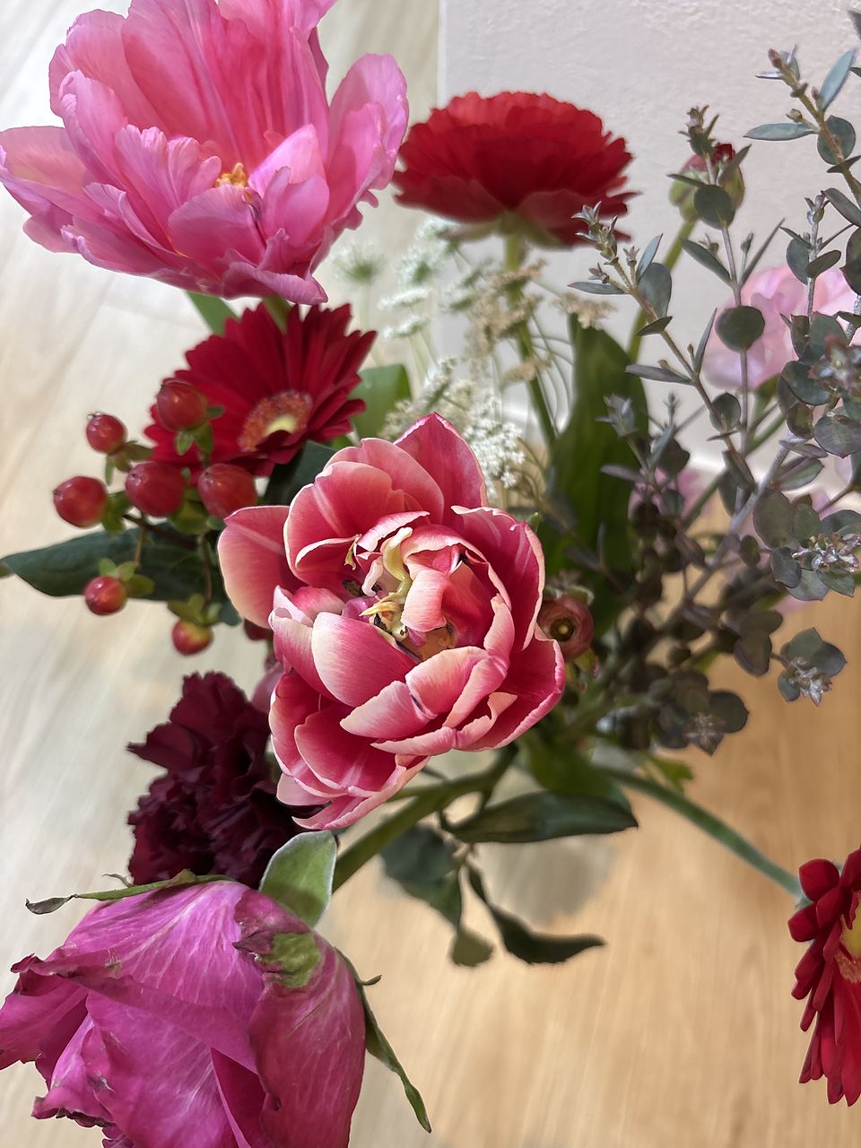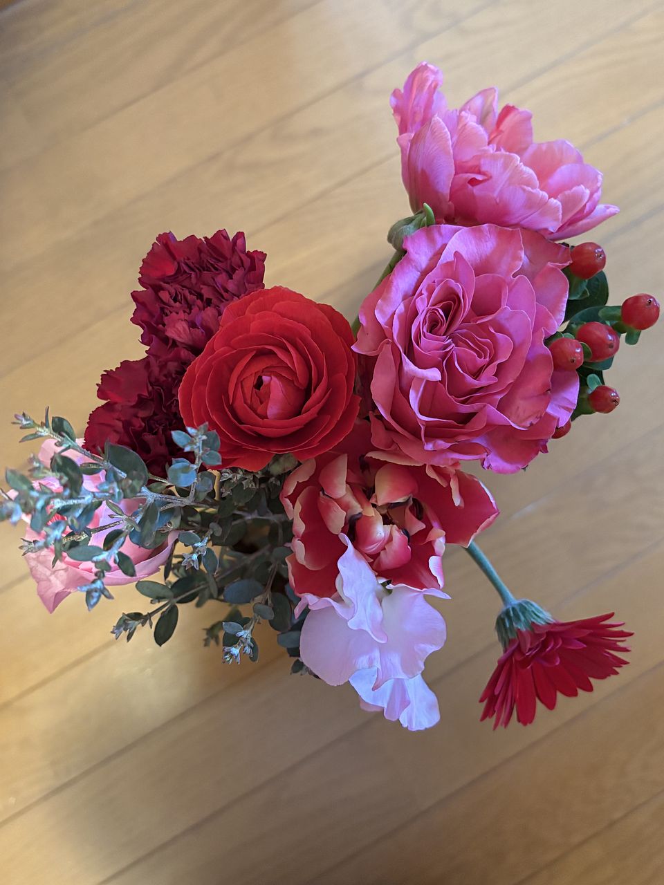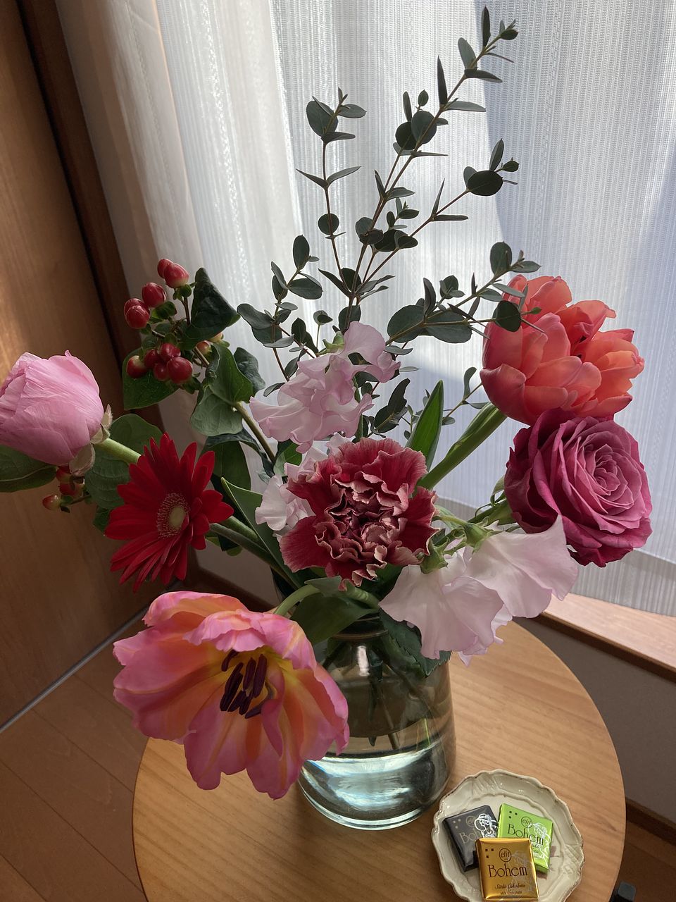 花材はチューリップ、バラ、ガーベラ、カーネーション、スイートピー、ラナンキュラス、