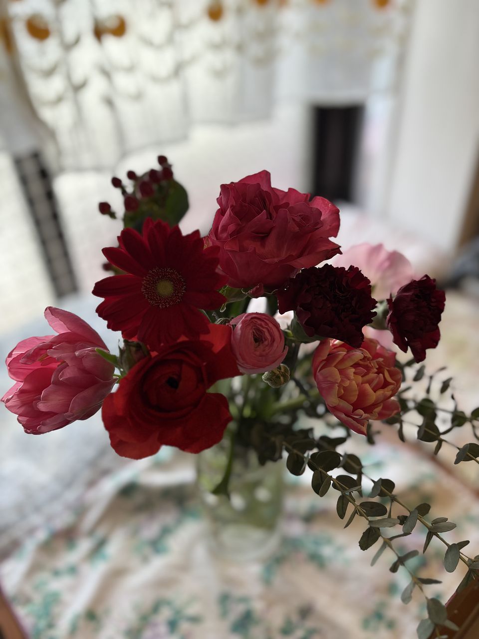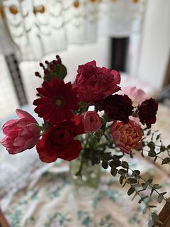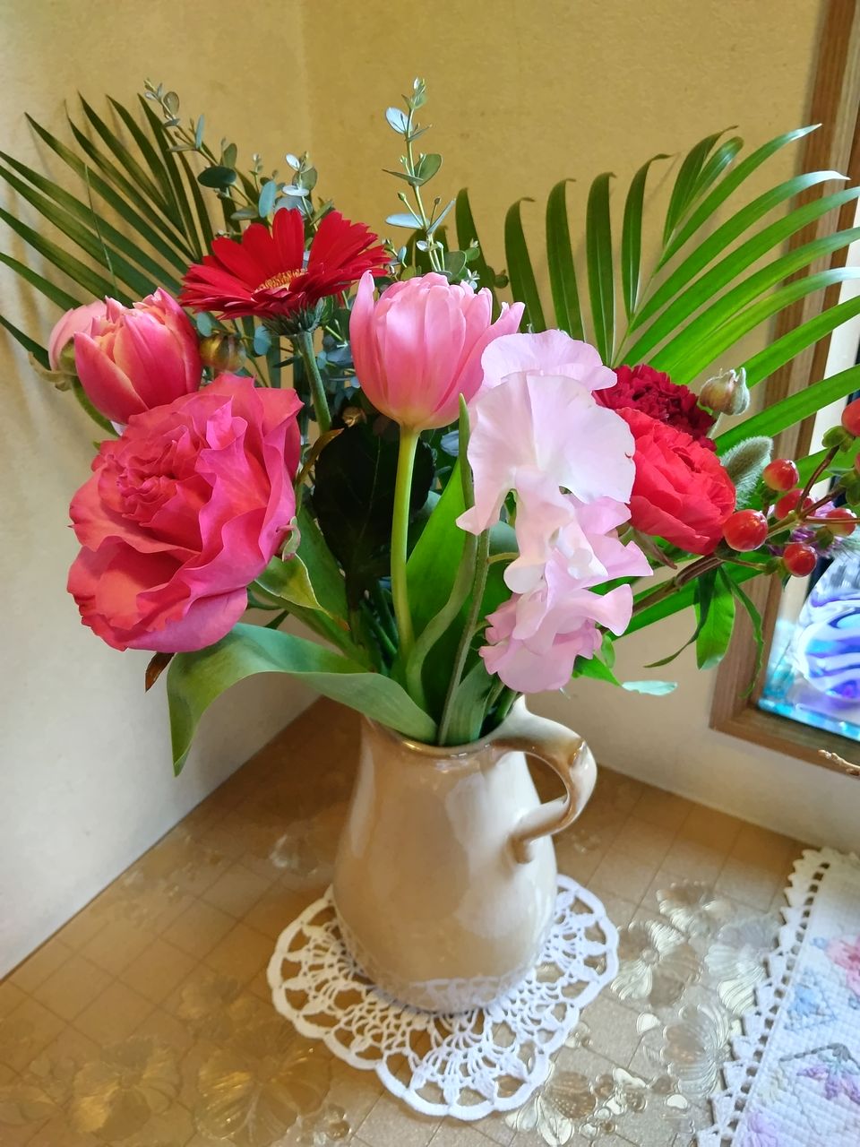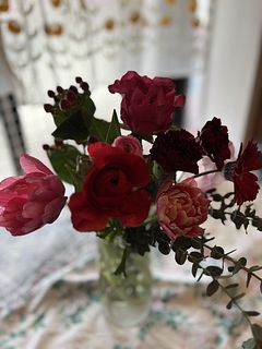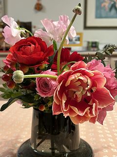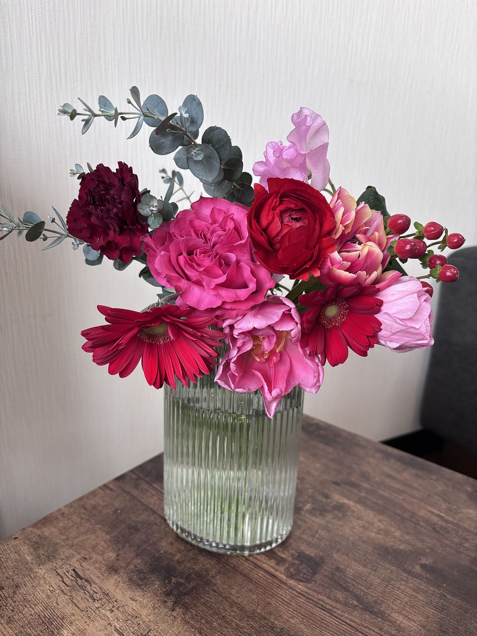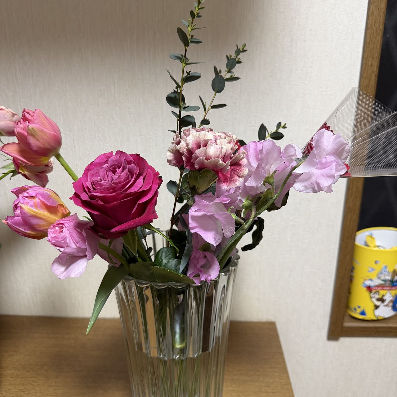 花材はチューリップ、バラ、ガーベラ、カーネーション、スイートピー、ラナンキュラス、