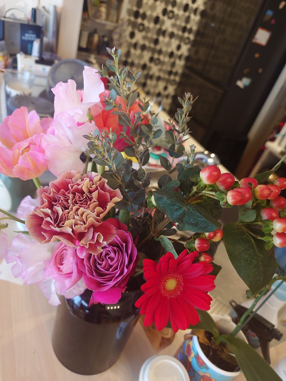 実物はヒペリカム、枝物はユーカリ。