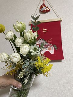 ミモザがめちゃくちゃ可愛い🩷 期待通りのお花達です! 一足早く春の気配がお部屋いっぱいに広がりました✨ ありがとうございました✨ お正月のお花もまだまだ健在です♪