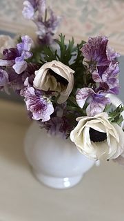 珍しいホワイトのアネモネ「ホワイトブラックセンター」と絞り染めのようなカラーリングが美しいスイートピー「詩かすみ」を贅沢に束ねて🦋