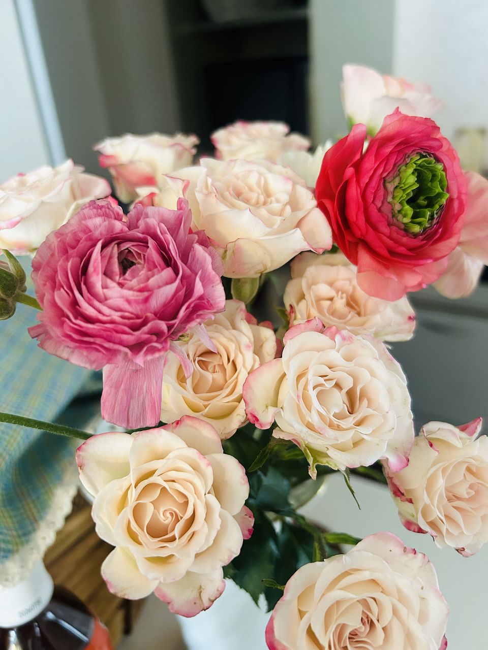 甘いピーチミルクのようなカラーリングのラナンキュラスとバラを贅沢に束ねました🍑🐮