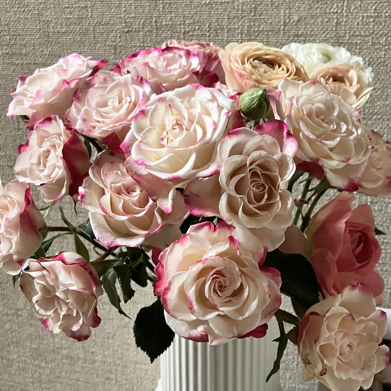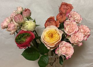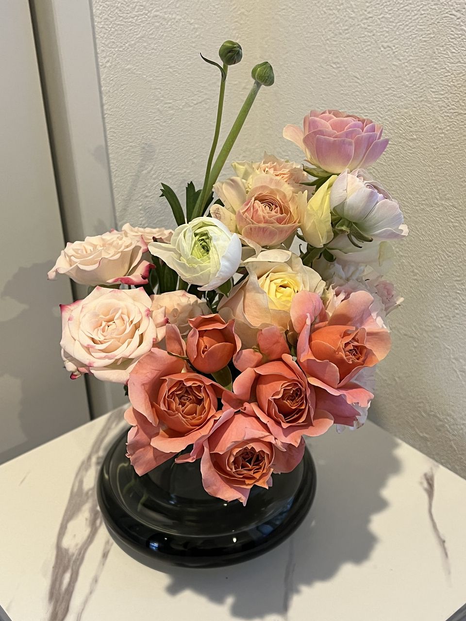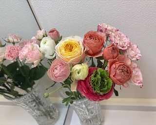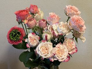 春らしいパステルカラーのバラとラナンキュラスが届きました。これから開くに従ってボリュームも出てくると思います。大好きなコラボです♡