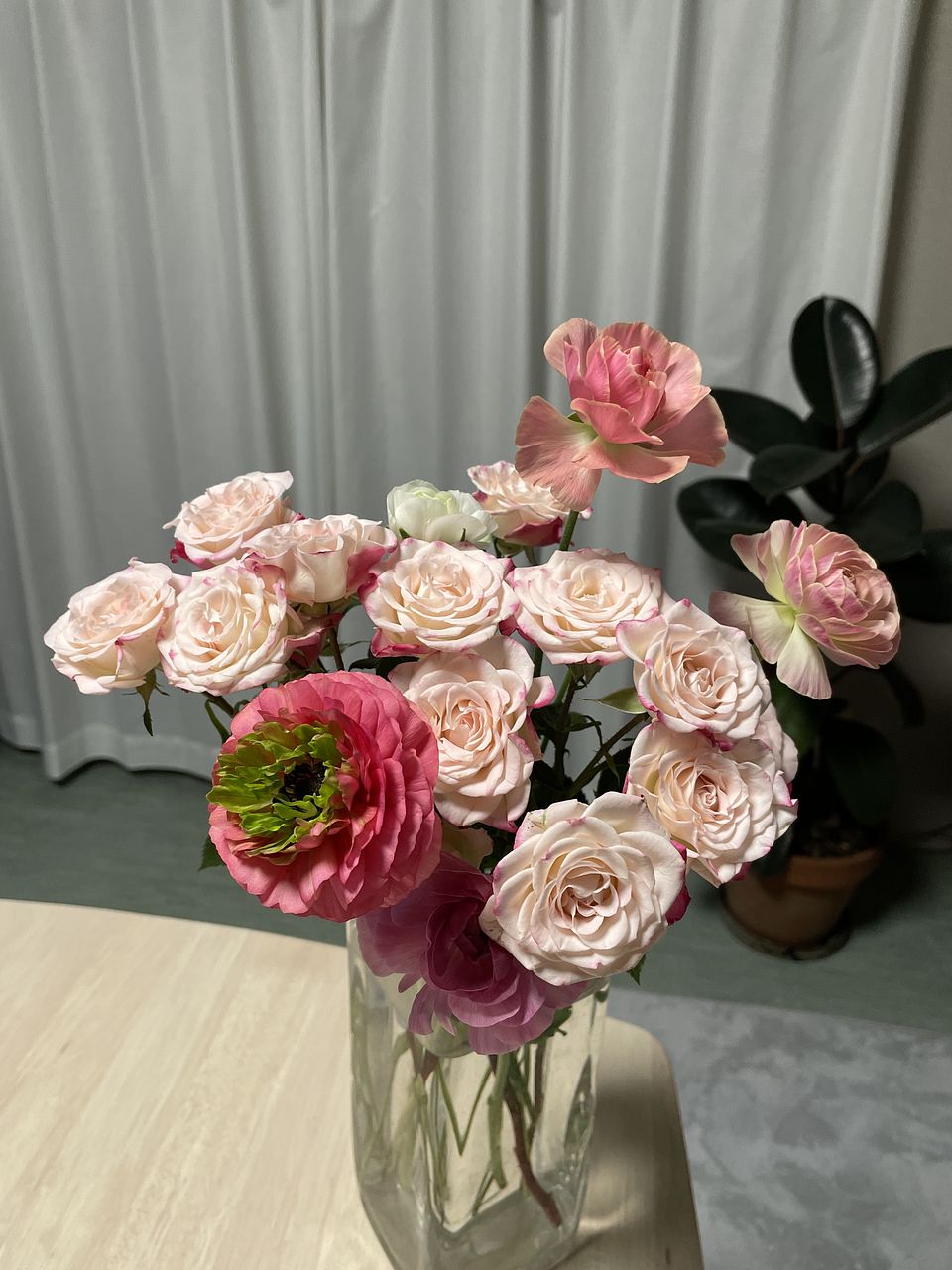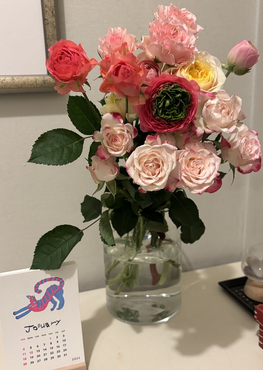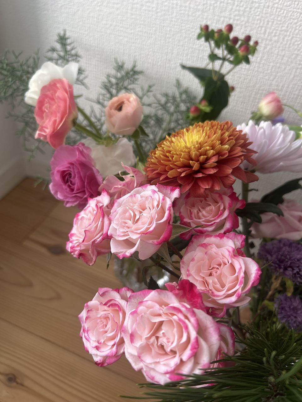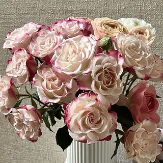 ほとんどがふちがピンクの白いスプレーバラのボリュームで淡い色合いのアネモネが少し。 アネモネが少し色あいも寂しい感じでした。 寒い時期ですし長く楽しめたらいいなと思います。
