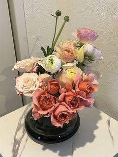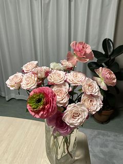 久しぶりの購入でした。 ピンク色をイメージしていたのですが ホワイト色のラナンキュラスが入る事で 全体的に優しい色でまとまってました。 とても綺麗で華やかに咲いてます❣️
