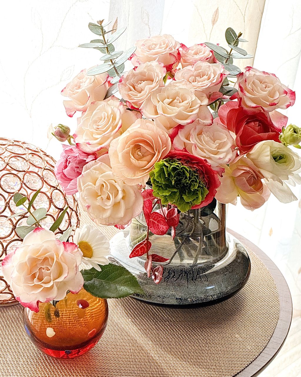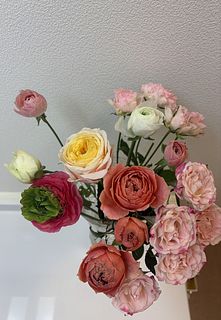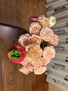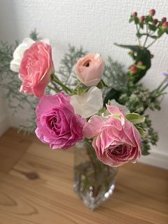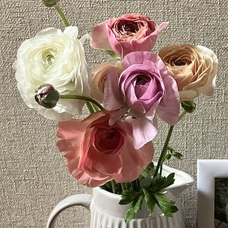 とても可愛い色合いで空間がふわっと明るくなる感じです。少しずつ茎を短くしたり、分けて飾ったりしながら長く楽しむことが出来ました。1番大輪のラナンキュラスは2週間以上飾っていました♪