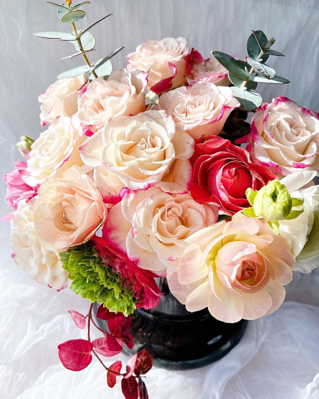 とても可愛いお花が想像以上にたっぷり入っていて大満足です。 庭のユーカリを添えて生けました♪ おしゃれなフラワーベースも一緒に購入したので、オシャレ度UPしました。