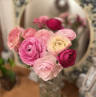濃淡のバラエティ豊かなピンクのラナンキュラスをたっぷり束ねて。