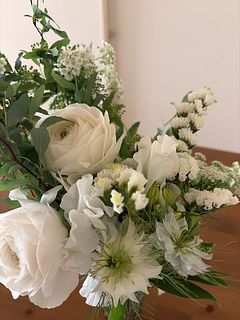 盛り盛りの白のお花とグリーンで爽やかで とても素敵です。 けれどスイトピーの茎が1本折れ曲がり一緒に活けれなかったので、別に小さいコップに…それが少し残念でした。