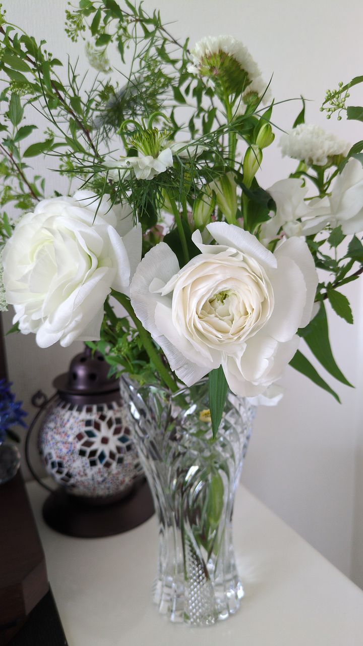 boxを開けたら とても全部のお花がフレッシュで そのままプレゼントに出来るような花束でした。 お花の種類も大好きな物が沢山!感激でした♡ 早速水揚げして飾りました。 前にいただいた ラナンキュラスと合わせたり… これからも楽しめそうです。