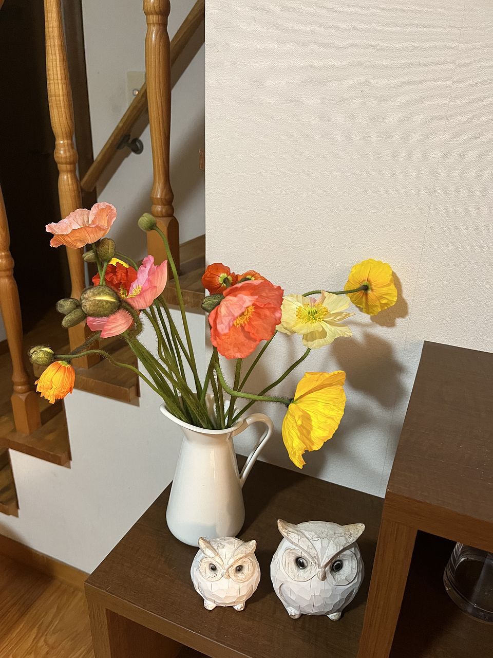大好きなポピー︎をたっぷりと。寒い中届いて、暖かい部屋に深水で置いたら、30分たたないうちに、次から次から開き出しました!生命力溢れる大好きなポピー。もったいないから涼しい玄関に移動しました😅
