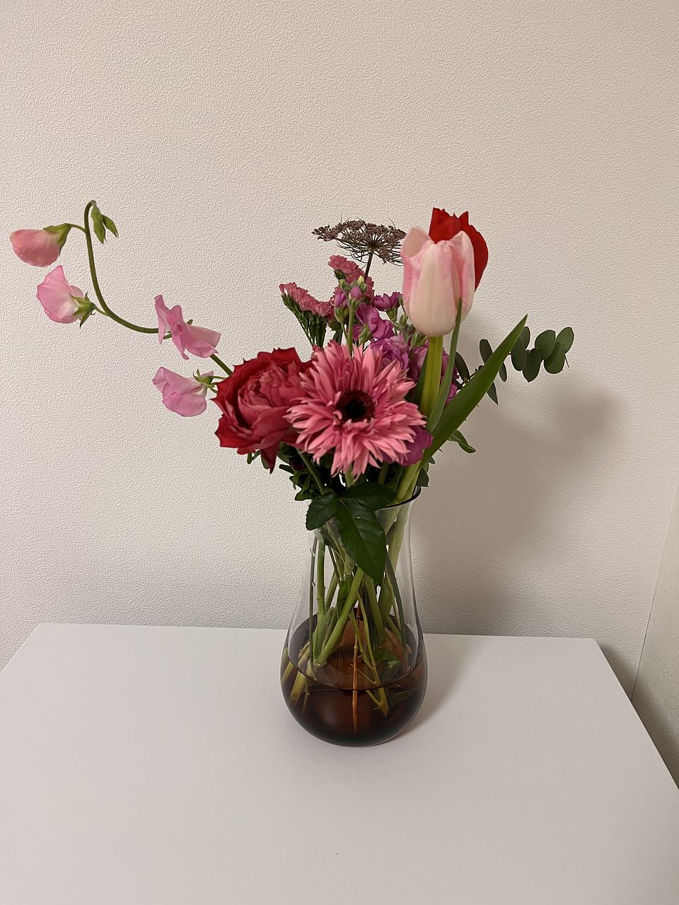 自分への誕プレです💐 届いたときは赤が少なくて残念に感じましたが、だんだんとピンクのストックが咲いてボリュームが出てくると、これはこれで可愛いなと思えてきました💐 一緒に頼んだ花瓶も安定感があり使いやすいです!