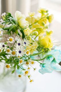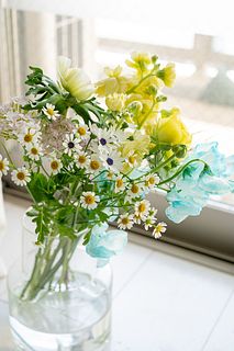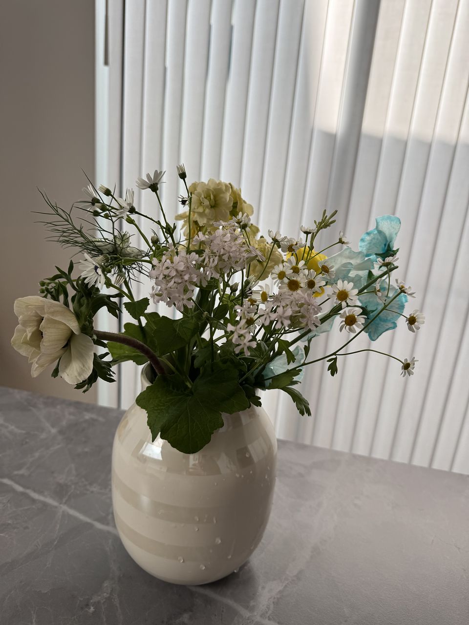 色合いとお花のチョイスが気に入ってます。 アネモネも可愛いし、小花があるとボリュームが出て見た目が良いです。🤗 水色のスイトピーがアクセントになってます。👍